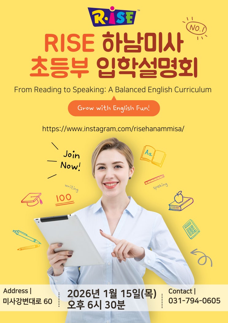 안녕하세요, 라이즈 어학원입니다 라이즈 초등부 프로그램을 보다 자세히 안내드리고자 초등부 입학설명회를 진행합니다! 이번 설명회에서는 ✔️ 초등부 전반적인 커리큘럼 구성 ✔️ 라이즈의 교육 방향과 원 운영 가치 ✔️ 아이들의 영어 학습 흐름과 성장 과정 등을 중심으로 편안하게 설명드릴 예정입니다 초등부 진학을 앞두고 계시거나 라이즈 초등 프로그램이 궁금하셨던 학부모님들께 도움이 되는 시간이 될 수 있도록 준비하겠습니다✨ 일시: 1월 15일 (목) 시간: 오후 6시 30분 장소: 라이즈 어학원 신청을 원하시는 경우, 원으로 전화 주시면 감사하겠습니다. 많은 관심과 참여 부탁드립니다 감....... <img src="https://blogthumb.pstatic.net/MjAyNTEyMjRfMjMz/MDAxNzY2NTQ3ODQ5MzA1.0IEz9gIttbNmxQjv0WkhfWEBxoFYxkxvuJLFPI2P0wsg.WyejCh4TTV3mL_HAj5Fe6psoAONneeByIJstX-ZluaAg.JPEG/%C1%A6%B8%F1%C0%BB_%C0%D4%B7%C2%C7%D8%C1%D6%BC%BC%BF%E4.jpg?type=s3" />