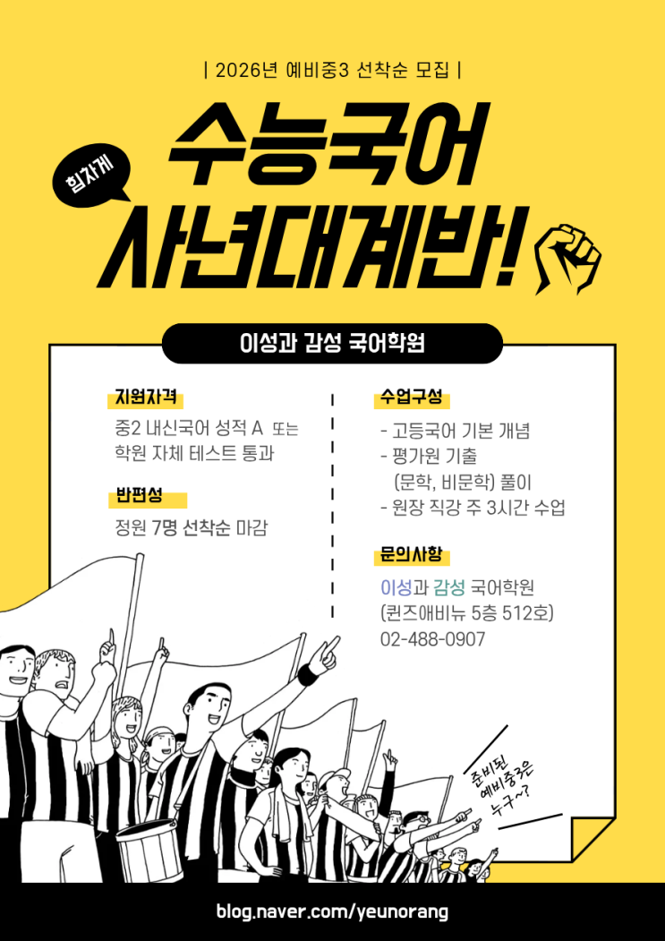 희망 가득한 새해가 밝았습니다. 학생들의 국어 실력과 논리적 사고를 책임지는 이성과 감성 국어학원에서 든든한 학습 파트너를 만나보세요! 예비 중3 대상 <수능국어 4년대계반> 안내 벌써! 중3 준비에 들어가야 하는 시기가 되었습니다. 국어는 단순히 내신만 챙긴다고 끝나지 않습니다. 결국은 수능 국어가 아이들의 입시를 좌우하잖아요. 그래서 저희 이성과 감성 국어학원에서는 특별한 수업을 준비했습니다. 열심히 할 준비가 된 학생을 7명 선발해 중3부터 고3까지, 4년 동안 내신과 수능을 동시에 잡는 체계적인 커리큘럼으로 성적을 철저하게 관리합니다. ✔️ 수업 핵심 내용 - 평가원 기출 문제 풀이 (문학·비....... <img src="https://blogthumb.pstatic.net/MjAyNTEyMzFfNCAg/MDAxNzY3MTY0NTQ3MDYx.GY0xo-pQZtGMtppy4ZxYW5JD-0_E_29eCkpoFFyKWuEg.HErwLjbPC4Xu17a_D6UyrFNNBtPIRsvVvduOumPaIwIg.PNG/0.png?type=s3" />