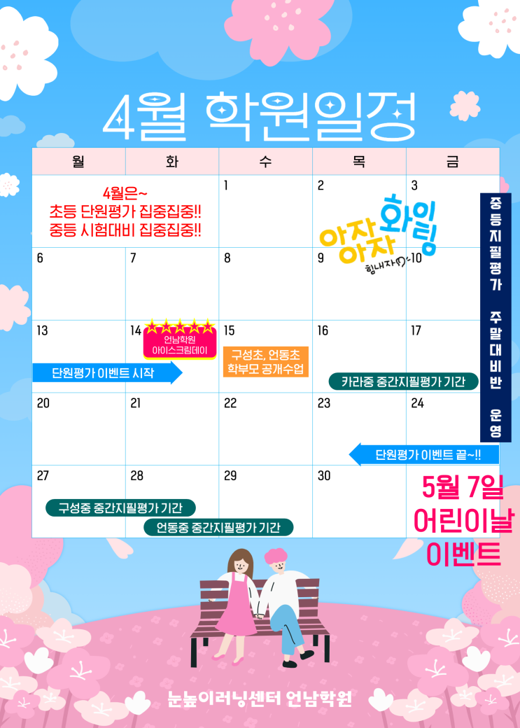 안녕하세요~ 우리 언남학원, 4월 소식전합니다~ 항상 아이들을 생각하고 평가에 진심인 언남학원! 상담전화 031-283-0910 #언동초학원 #구성초학원 #구성학원 #언남학원 #눈높이러닝센터 #눈높이학원 #구성초학원추천 #우리동네학원추천 #언남동학원추천 #언남동학원 #언동초학원추천 #수학학원 #국어학원 #영어학원 #초등학원 #학원추천 #언동초 #구성초 #언동중 #언동중수학 #언동중국어 #언동중영어 #언동중내신 #언동중시험 #언남동초등학원 #중학수학 #언동중족보 #언남동맛집 #공부맛집 #시험대비 <img src="https://blogthumb.pstatic.net/MjAyNjAzMzFfMTUx/MDAxNzc0OTY3NjI4NDgz.hqI2jMikSflov3CshhCZlymBqe31hTKjNc7BDbkZw9og.-cNR3XsCJm4rZ0Fw5D1G_uQxMxnFrbDCzlNmi6PJ-kYg.PNG/%BD%BD%B6%F3%C0%CC%B5%E51.PNG?type=s3" />