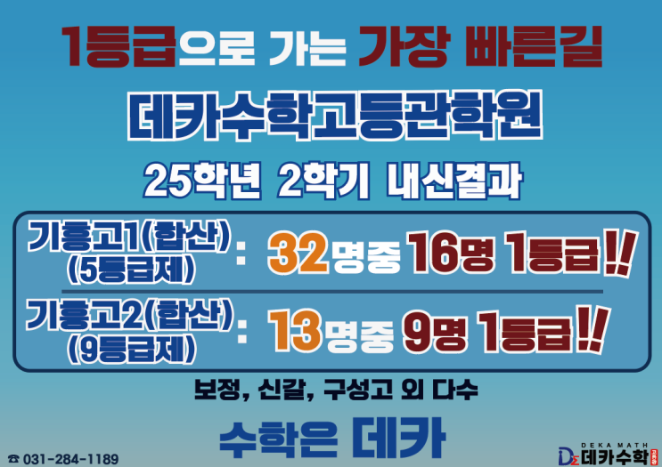 변함없는 1등급전문!! 데카수학학원고등관 입니다. 데카수학고등관학원의 25년 2학기 내신의 합산결과입니다. 데카수학고등관학원은 새학년에도 학생의 노력에 결과로 보답하도록 최선을 다 하고있습니다. 각 학생들이 원하는바를 이룰 수 있도록 데카수학고등관학원은 학생의 성적향상에 온 힘을 다하겠습니다. 데카수학학원 2025년 1학기내신 결과 https://blog.naver.com/dekamath/223963936629 데카수학고등관학원은 대치동학원가에서 10년이상 강의한 노하우로 우리 아이에게 최고수준의 교육을 받도록 하고있습니다. 공부를 하겠다는 마음만 가지고 오십시오. 성적과 실력은 데카수학에서 책임지겠습니다. 데카수학학원의 모든 선생님들은....... <img src="https://blogthumb.pstatic.net/MjAyNjAxMDhfMjU5/MDAxNzY3ODc2ODExNzUy.J9ozqjBy0oCyNIid1N-SBkPQyeF1zxTrj2IWeocnHFwg.mfFzhL8qanBL7SyH9lPmbwAx88QvG9bGDvObUxW-HpMg.PNG/image.png?type=s3" />