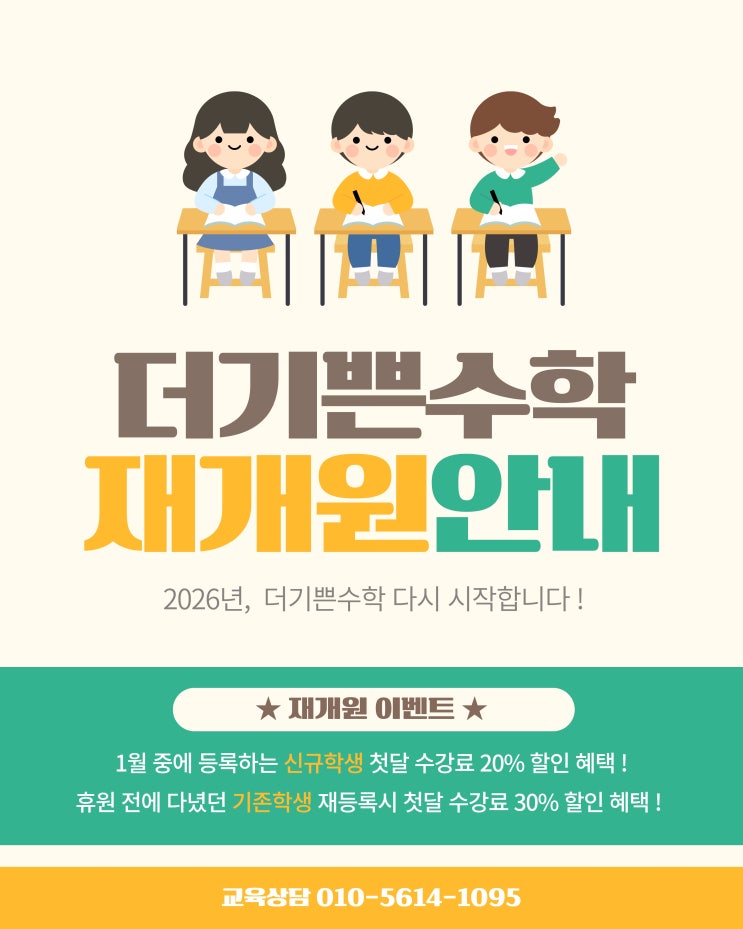 2025년 3월에 처음 개원했던 <더기쁜수학>은 원장 개인의 사정으로 6월까지만 짧은 운영 후에 잠정 휴원 기간을 갖게 되었습니다. 그간 함께 공부해왔던 학생들과 정도 많이 들었고 제가 직접 학생마다 개개인에 맞춰 짜둔 커리큘럼을 따라 열심히 공부해오고 있던 터라 당시엔 정말 아쉽고 미안한 마음이 컸었는데요. 학부모님들과 학생들의 배려와 이해로 눈물로 아쉬운 이별을 고했습니다. 그리고 시간이 흘러 어느덧 새해가 되었네요. 2026년 1월, 더기쁜수학 다시 시작합니다 ! 처음 개원하고 학생들을 만나 커리큘럼 짜고 상담하고 수업하던 때의 설렘과 기쁨을 잊을 수 없습니다. 아직 제대로 수학을 시작해본 적 없는 학생 그동안....... <img src="https://blogthumb.pstatic.net/MjAyNjAxMTJfMjk1/MDAxNzY4MTc5Nzg4Njk4.eKa9aXbfAPNM2T7pyPv-ge6F2gUOl4WhKKct1Wbylqkg.kEmBe4OO12JYA_b8w5snfgr4knbglN5Qk1ORtCRlbrcg.JPEG/%C0%E7%B0%B3%BF%F8%BE%C8%B3%BB.jpg?type=s3" />