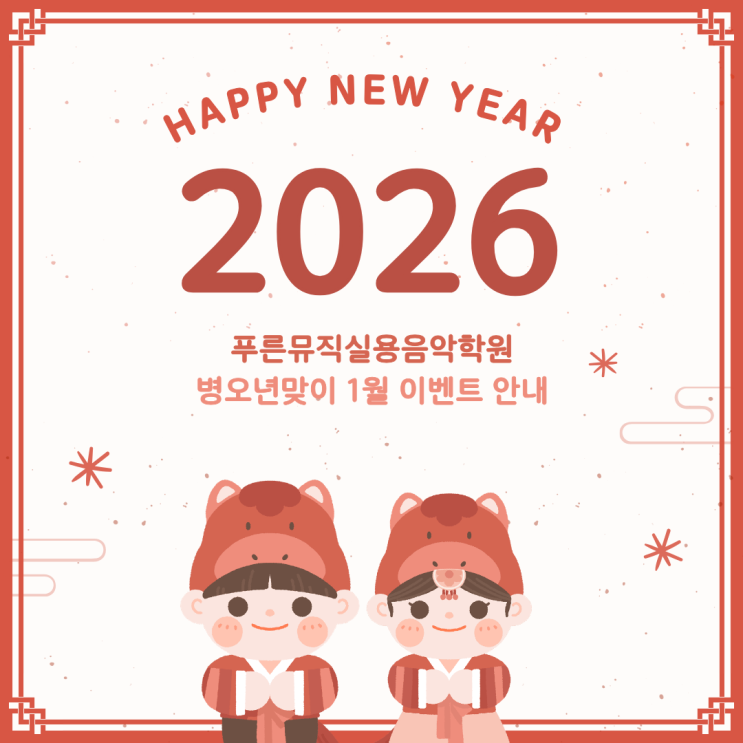 안녕하세요. 푸른뮤직실용음악학원입니다. 2025년 마무리는 잘 하고 계신가요? 내일이면 2026년 병오년(丙午年) 이 시작되는데요! 붉은 말의 해답게 뜨거운 에너지와 도전의 기운이 가득한 한 해, 여러분의 음악적인 도전을 푸른뮤직이 함께 응원합니다 새해를 맞아 수강생분들과 새로 음악을 시작하시는 분들 모두를 위한 2026년 1월 신년 이벤트를 준비했습니다! 2026 행운의 뽑기 이벤트 참여만 해도 100% 당첨! 2026년 새해 소원도 빌고, 음악을 시작하는 행운도 함께 가져가세요 ✔️ 참여만 해도 무조건 당첨! ✔️ 1등~4등까지 꽝 없는 선물 증정 이벤트 안내 * 2026년 새해 소원적고 행운 뽑기 참여 * 1등....... <img src="https://blogthumb.pstatic.net/MjAyNTEyMzFfNzcg/MDAxNzY3MTQyNTc3OTQx.4zSCAAlrUkZeKXvWX3ZBcmjVEF6Xno8Xq9ah1Xopq_0g.AqSp9JL9OmHE3f0SbjOmEAU3V6Pn_QB9nHavEwNeN7kg.PNG/1.png?type=s3" />