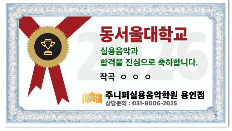 26학년도 수시1차 동서울대학교 실용음악과 작곡 전공 합격을 진심으로 축하합니다. 즐겁고 활기찬 대학 생활이 되길 무한 응원합니다. ^^ 용인 동백 주니퍼 실용음악학원은 체계적인 커리큘럼과 맞춤형 지도를 통해 학생들의 가능성을 현실로 만들어갑니다. 앞으로도 더 많은 학생들이 자신의 음악적 가능성을 발견하고, 꿈꾸는 무대에 설 수 있도록 든든한 길잡이가 되겠습니다. 감사합니다. ^^ [ 대학 / 예고 입시상담 : 031-8006-2025 ] #실용음악대학입시, #예고입시, #예고편입, #안양예고편입시험, #보컬, #드럼, #기타, #피아노, #건반, #작곡, #미디, #취미, #실용음악입시, #용인실용음악학원, #동백실용음악학원 <img src="https://blogthumb.pstatic.net/MjAyNTEyMjJfMTg0/MDAxNzY2MzMyNDQ2NzU1.T3HmFsj2etEPO0lLKJWUyQfw-TqLVuFdkTJ5m2fRk_Ig.GF2BN0A-ods2euY_FRArOXR39jJrlfa1OwZeZCemGFwg.PNG/%BC%AD%B5%BF%BF%EC-%B5%BF%BC%AD%BF%EF%B4%EB.png?type=s3" />