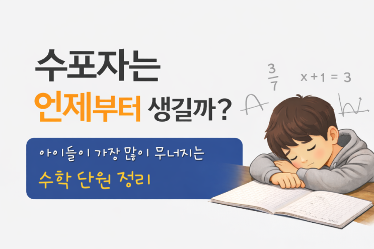 많은 학부모님들이 이렇게 말씀하세요. “우리 아이가 원래 수학을 못하진 않았어요…” 실제로 수포자는 갑자기 생기지 않습니다. 특정 단원에서 이해가 끊기면서 시작돼요.. 오늘은, 학생들이 수학을 배워 가면서 어려워 절망하고 무너지는 단원들에 대해 이야기 해 보려해요! 저 역시도 어릴 적 그랬답니다... ① 초등 고학년 — 분수·소수 분수와 소수는 왜 힘들까요? 먼저 눈에 보이지 않는 수 개념이기 때문이에요. ‘나누기’ 개념이 제대로 안 잡힌 상태에서 진도를 진행하고 공식처럼 외워서 풀다 보면 금방 한계 도달하게되죠. 대표적인 어려움의 신호 : 분수 크기 비교를 헷갈린다 분수×분수, 소수×소수에서 이유를 설명 못함 문....... <img src="https://blogthumb.pstatic.net/MjAyNjAxMTBfMjc0/MDAxNzY4MDQ3OTUzMTkz.eI59wonNSZ2MO-3clIi3sjQciC4IWu19eZ-s9b8RPFMg.2J6t5IVt_X7THvPMxMDg2DsY-4X01W-iU550B0mvw2Ug.PNG/900%A3%DFfile%A3%DF0000000055b07207b9d67722651b1614%A3%A81%A3%A9.png?type=s3" />