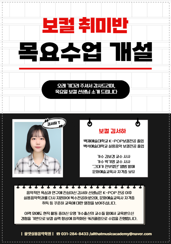 새로운 계절, 새로운 시작 설레는 새학기를 맞아 보컬 취미반을 새롭게 오픈합니다! 노래를 좋아하지만 시작이 망설여졌던 분들, 무대가 아니어도 나만의 목소리를 찾고 싶은 분들, 편안한 분위기에서 즐겁게 배우고 싶은 분들을 기다리고 있어요 기초 발성부터 차근차근✌ 나에게 어울리는 곡 찾기 부담 없이 즐기는 소규모 클래스 노래를 통해 하루의 스트레스를 날리고, 나만의 작은 성취를 쌓아보세요! 우리 김서하 쌤의 밝고 따뜻하고 발랄한 분위기 속에서 여러분의 목소리가 빛날 수 있도록 함께하겠습니다 지금, 당신의 첫 한 소절을 시작해보세요 문의 및 상담은 언제든 편하게 주세요! 운영시간 월....... <img src="https://blogthumb.pstatic.net/MjAyNjAzMjdfMTM0/MDAxNzc0NTkyNzA5MTkx.vMSTIpxte2gGvG37p6srTxt9NshSoUtBYcwMvGQKVz8g.g-yxkIR9BPUVdC1KqBKXLVLlys0eB40SbHF14IUDvr8g.PNG/IMG%A3%DF3320.PNG?type=s3" />