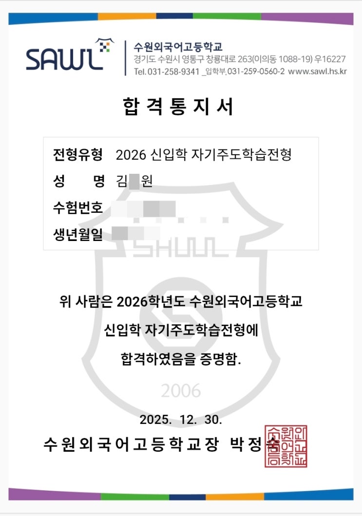 2025년 마지막 내신과 졸업, 그리고 2026년 수원외고 합격 - 김O원 (서원중)