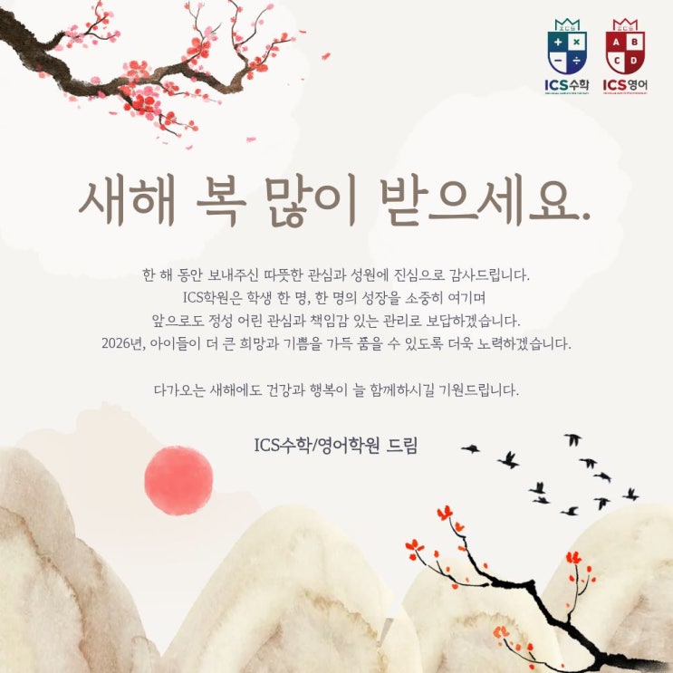 안녕하세요? #수지영수학원 #중고등내신전문 #수지수학학원 # 수지영어학원 개인별 프리미엄 맞춤 학습 #ICS학원입니다. 올해도 많은 분들의 관심과 아낌없는 지지에 감사드립니다. 내년에도 정성 어린 관심과 책임감 있는 관리로 학생들의 성장을 위해 더욱 노력하겠습니다. 다가오는 새해에도 건강과 행복이 늘 함께 하시길 기원합니다. 감사합니다! ICS학원은 학생 한 명, 한 명을 위한 맞춤 학습을 제안합니다. 자녀의 수학, 영어 학습으로 고민이 있으실 땐 상담 전화주세요. ICS수학학원 ::: 031-889-9980 ICS영어학원 ::: 031-889-9982 ★ 오시는 길 ★ <img src="https://blogthumb.pstatic.net/MjAyNTEyMzFfMTcg/MDAxNzY3MTUzMDI4MDI5.HBqtDtLSyUkcrfDA542hUCvlX_1I1wcSX6gI_pvW1vsg.wMX_iBfWE1dlJjRfHAFfx5GGUVqeebxXLj9fHTgeP6wg.JPEG/1.jpg?type=s3" />