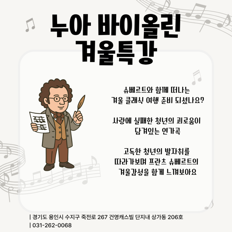 안녕하세요, 감성과 품격이 함께하는 누아 바이올린입니다. 어느덧 차가운 공기가 겨울이 왔음을 실감나게 하는 요즘입니다. 이 계절과 가장 잘 어울리는 작곡가, '가곡의 왕' 프란츠 슈베르트와 함께 특별한 겨울 여행을 떠나보려 합니다. 이번 겨울특강은 단순히 악보를 읽는 법을 넘어, 한 예술가의 삶과 감정이 녹아있는 '연가곡'의 세계를 탐험합니다. 사랑에 실패한 청년의 괴로움과 고독, 그리고 그 끝에 피어난 아름다운 선율들... 고독한 청년의 발자취를 따라가다 보면 어느새 아이들의 마음속에도 깊은 겨울 감성이 자리 잡게 될 거예요. 너와 나, 음악으로이어지는 공간 아이부터 어른까지, 모두....... <img src="https://blogthumb.pstatic.net/MjAyNjAxMDZfMTU5/MDAxNzY3NjgyNDczODgz.TD8eN8mqRMqoEAuC1dWq9LVSlKrQYIC_J3zf-E9yzEAg.g7bkU-sXylIQy9huzSKKv6-ShhXrOuYWogaexZvFAU0g.PNG/%C1%A6%B8%F1%C0%BB_%C0%D4%B7%C2%C7%D8%C1%D6%BC%BC%BF%E4_%281%29.png?type=s3" />