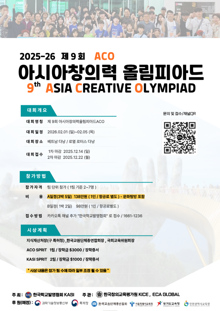 안녕하세요! 광교 상현동 수학 영어 학원 초이스쿨 학원입니다. 오늘은 한국창의교육평가원에서 주관하는 '2025-26 제9회 아시아창의력올림피아드 ACO 참가자 모집' 포스팅을 들고 왔습니다. 2025-26 제9회 아시아창의력올림피아드 ACO 참가자 모집 2025-26 제9회 아시아창의력올림피아드 ACO 참가자 모집 ○ 공모개요 - 대회명: 2025-26 제9회 아시아창의력올림피아드 ACO - 대회성격: 초중고 학생 대상 국제 창의력 경진대회 - 대회장소: 베트남 다낭 로열 로터스 다낭 - 참가형태: 팀 단위 참가 2명에서 7명 구성 - 주최: 한국학교발명협회 KASI - 주관: 한국창의교육평가원 KICE, ECA GLOBAL ○ 기간 및 일정 - 대회일정: 2026년 2....... <img src="https://blogthumb.pstatic.net/MjAyNjAxMjJfOTcg/MDAxNzY5MDYyMjE3NDY2.BA380N7Y22wyKhS2MqtvaOZDQJaiCBxzVmOX1bLZbFIg.7XE7pWB07jqJuSLkFVsDOHkyatcYhh6IAMvhfVTHhcAg.PNG/533542.png?type=s3" />