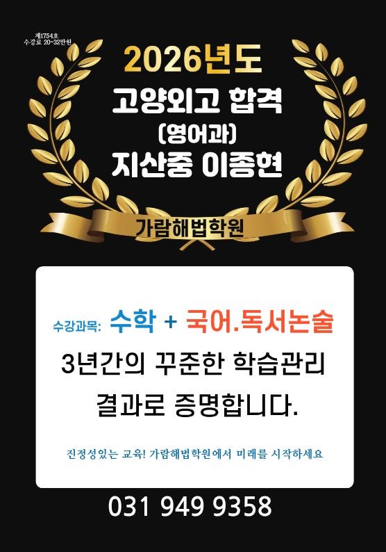 안녕하세요. 가람해법학원입니다. 오늘은 저희 학원에서 2024년, 2026년에 걸쳐 꾸준한 학습 관리로 외고·애니고 합격이라는 성과를 만들어낸 학생들의 이야기를 공유하고자 합니다. 특목고·외고 진학, 왜 어렵다고 할까요? 외고, 애니고, 특목고 진학은 단순히 성적이 좋다고 합격하는 구조가 아닙니다. ✔ 내신 성적 우수 ✔ 자기주도적 학습 태도 ✔ 논리적인 사고력 ✔ 질문에 답하는 표현력 ✔ 자신의 생각을 말과 글로 풀어내는 힘 이 모든 요소가 종합적으로 평가됩니다. 특히 최근 입시는 논술형 사고력 + 면접형 표현력을 중요하게 봅니다. 2024년 성과 한국애니고 합격 – 한가람중 곽선영 한국애니고 합격 – 한가람중 권예....... <img src="https://blogthumb.pstatic.net/MjAyNjAxMDlfMjE4/MDAxNzY3OTM3Nzg3Nzk0.MleWRnyTJaQVn9S4e_XxO2qrxeH3BNKPsrdadl4GoO4g.g_kRLSZ2vDfpTSIDvOaPvRrzS-6xzLCteCs59HGIK1Eg.JPEG/1767935325521.jpg?type=s3" />