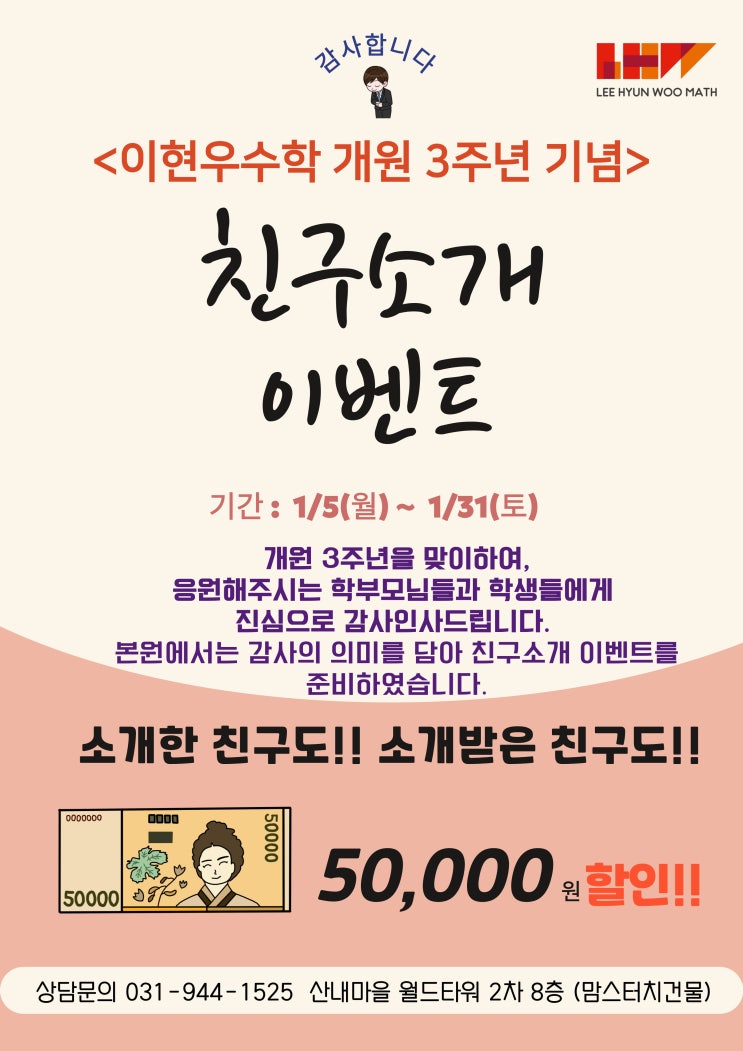 안녕하세요 최상위권의 이유있는 선택, 이현우수학입니다. 개원 3주년을 맞이하여 친구소개 이벤트를 실시합니다. 소개해준 친구도, 소개받은 친구도 모두 50,000원 할인!! 기간: 1/5~1/31 <img src="https://blogthumb.pstatic.net/MjAyNjAxMTZfMjAx/MDAxNzY4NTUyMzYyNzAx.FgmQt95fUsRJgVqARklUkctrAFoG8EQcDE5m1Dt7CoIg.pk7bHeAvb17I6nK5TrtU1pZWLfw4vT5eb7LrM4IAQXAg.JPEG/KakaoTalk_20260103_140509063.jpg?type=s3" />
