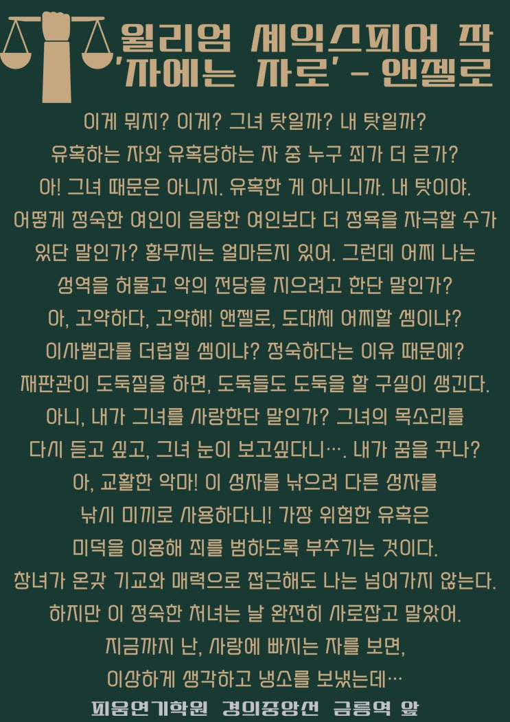 [파주연기학원] 윌리엄 셰익스피어 작 '자에는 자로' - 앤젤로 / 준대로 받은대로 / 눈엔눈 이엔이 / 고전 독백 대사