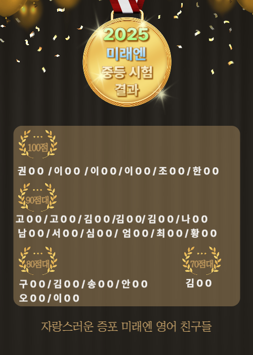 중1,2,3 전원 영어 내신 A 등급! 중학생 자녀의 시험이 끝난 지금, 누구보다 긴장하셨을 학부모님들께 이번 2학기 지필평가 결과를 가장 먼저 공유드립니다. 점수만 보면 수치일 수 있지만, 그 안에는 아이들의 몰입, 변화된 태도, 그리고 무엇보다 과정을 통해 만들어낸 실력이 담겨 있습니다. 아이들이 한 달간 얼마나 노력했는지, 그리고 어떤 흐름으로 준비했는지 보여드릴게요. 중1·2·3 각 학년, 이렇게 준비했습니다 내신 대비는 단지 암기의 반복이 아니라 핵심 개념을 체계적으로 정리하고, 문제에 적용할 수 있는 힘을 길러주는 과정입니다. 이번 중간고사는 한 달전 중3이 가장 먼저 시작됐고 중1,2 학년은 오늘 마무리 되었습니....... <img src="https://blogthumb.pstatic.net/MjAyNTEyMTlfODYg/MDAxNzY2MTIyNTI4MjEw.Q22_0zk8tiQrKS1x9pFzvHd_67JKaH0BxMQtd0vcassg.gr5BvvJV4mVsv2BC4wQc-bhMDIrkJiTsdBn6CQRpVXsg.PNG/%BD%C3%C7%E8%B0%E1%B0%FA%B0%FA-001.png?type=s3" />