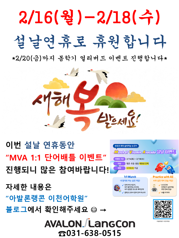 안녕하세요 아발론∫랭콘 이천어학원 입니다 오늘은 설날 연휴를 맞이하여 휴원하는 내용을 안내드립니다~ 2/16(월)~2/18(수) 설날 연휴로 휴원합니다 ♀️새해 복 많이 받으세요♂️ 설날 연휴동안 진행되는 "MVA 1:1 단어배틀 설날 이벤트"가 있으니 많은 참여 바랍니다~ ↓자세한 내용은 아래 글을 확인 바랍니다↓ 봄학기 얼리버드 이벤트는 2/20(금)까지 입니다! 개원 15주년 이벤트로 "연속재원생 할인이벤트"가 있으니 많은 참여 바랍니다~ ↓ 자세한 내용은 아래 랭콘/ 초등/ 중등 안내문을 확인바랍니다 ↓ 영어의 시작, 파닉스부터 수능 대비까지의 로드맵을 제공해 줄 수 있는 체계적....... <img src="https://blogthumb.pstatic.net/MjAyNjAyMTJfMTA0/MDAxNzcwODgyMjM3MDQy.1lFT8VOqEx09jn1M-etC7Q0i1G57wdC8XltR7TzWGYEg.tldG2R_FkVK_xGC9pyX2PitI4qGGWssL_csRjMHixjwg.PNG/2.16-18%BC%B3%B3%AF%BF%AC%C8%DE%C8%DE%BF%F8%BE%C8%B3%BB.png?type=s3" />