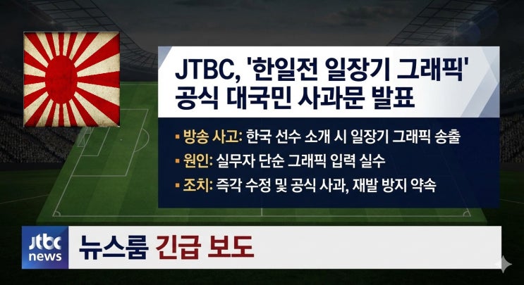 공식입장|JTBC 일장기 그래픽 방송 사고 대국민 사과문 발표…한일전 중계 중 무슨 일이?