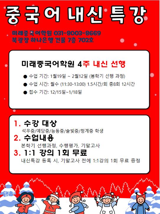 내신 대비 수업은 동탄 석우중/예당중/솔빛중/동탄중/푸른중/반송중 교재하고 자습서로 진행되며, 학교 선생님들이 쓰시는 보충자료와 몇 년 동안의 학교 시험문제도 함께 공부합니다. 동탄에서 12년 동안 쌓은 노하우로 시험 기출문제 및 시험 대비 핵심 포인트까지 짚어주고, 수행평가도 함께 준비합니다. 전화: 031-8003-8669 카톡: miraechinese 주소: 동탄반석로204 제일프라자 7층 (동탄 북광장 1동주민센터 맞은편 하나은행건물 7층) 사이트: http://airenwang.koreasmc.co.kr/ 블로그: https://blog.naver.com/airenwang <img src="https://blogthumb.pstatic.net/MjAyNjAxMTRfMTI3/MDAxNzY4MzgyODY4NjA3.aGPxd_lRyEKkQD3jRM2SBgfnyId5FKKbou9t3IUUp9sg.dDWhr6foXaaDLzjp-8WCU1dOrctUkK9yCKWWn3efGiQg.JPEG/56778.JPG?type=s3" />