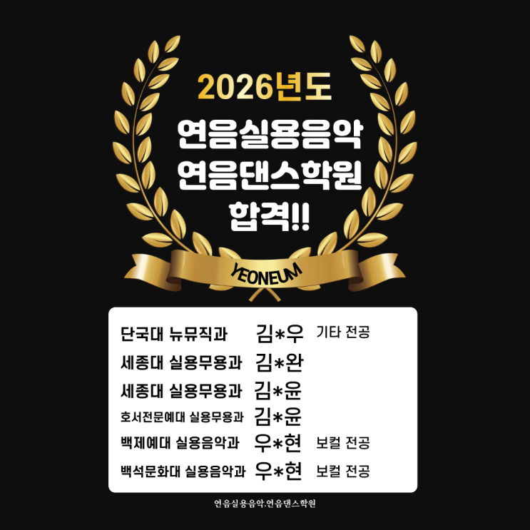안녕하세요~ 연음실용음악학원.연음댄스학원 입니다~! 합격 소식 전해요! 수시 전원 합격! 꾸준한 연습과 열정으로 멋지게 성장한 우리 연둥이들이 드디어 꿈을 이뤘어요 매일 연습실에서 흘린 땀방울이 이렇게 반짝이는 결과로 돌아왔네요 앞으로의 무대에서도 빛나는 퍼포먼스로 많은 사람들에게 감동을 전하길 응원합니다 ❤️ 연음실용음악.연음댄스학원은 여러분의 꿈이 현실이 되는 곳입니다 ✨ 저희 학원은 최고의 수업을 위해 유능한 강사님들을 엄선하여 초빙하였습니다!! 체계적인 커리큘럼으로 아이들을 지도하겠습니다! 감사합니다! 즐거운 하루 되세요! 저희 학원은 요기로 ↓ 찾아오시면 되세요~ 연음....... <img src="https://blogthumb.pstatic.net/MjAyNjAxMTRfMjU5/MDAxNzY4MzY4MDExNjIz.ZRtJ_RFxsglCDW6FjKIBlJscblOAwIQwMYxEYl98Sn8g.duC28Dh5MfCLEIeVRA37FAearWWIJGvGFYXo0mAvBPQg.PNG/26%B3%E2_%C7%D5%B0%DD.png?type=s3" />