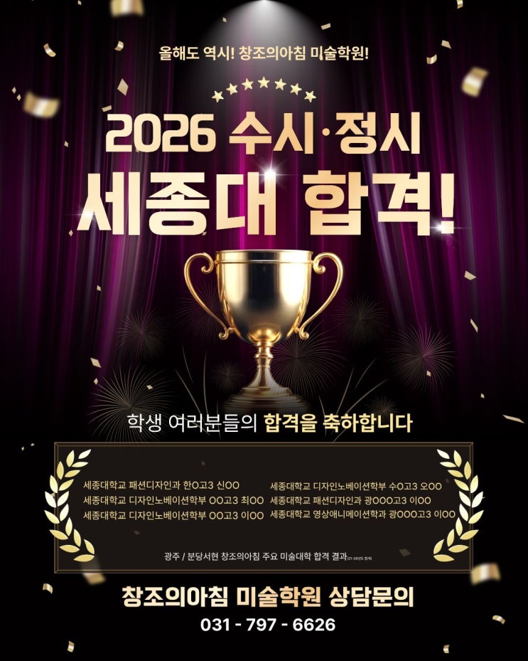 안녕하세요 창조의아침 미술학원입니다! 봄이 슬슬 다가오고 있는 3월! 다들 즐거운 개학을 맞이하셨나요? 오늘은 2026학년도 대학합격자 명단을 전해드립니다~! 합격을 축하합니다 최선을 다한 경기광주 / 분당서현 창조의아침 학생들의 2026학년도 합격 대박을 축하합니다! ✔기초가 튼튼하면 흔들리지 않습니다. ✔모든 입시 유형에 강한 학원 ✔강사교육에 가장 많은 투자를 하는 학원 상담문의 031-797-6626 (태전중앙2길21 태전센트럴타워 6층(601,602,603)) 창조의아침미술학원 경기광주캠퍼스 경기도 광주시 태전중앙2길 21 센트럴타워 6층 601호, 602호, 603호 상담가능시간 PM1:00~PM 9:00 #태전동미술학원 #경....... <img src="https://blogthumb.pstatic.net/MjAyNjAzMDNfMTQz/MDAxNzcyNTI2NDUwMTI5.0pjZxjXDXNgcGgfgCtZJrJ-lCkcbBvzfF3UnAIS3NwAg.Pgg0XrSH2d4Np5izfKhmi5RvvwREkG1eBBNhxjeja9Eg.JPEG/1%BC%BC%C1%BE.jpg?type=s3" />