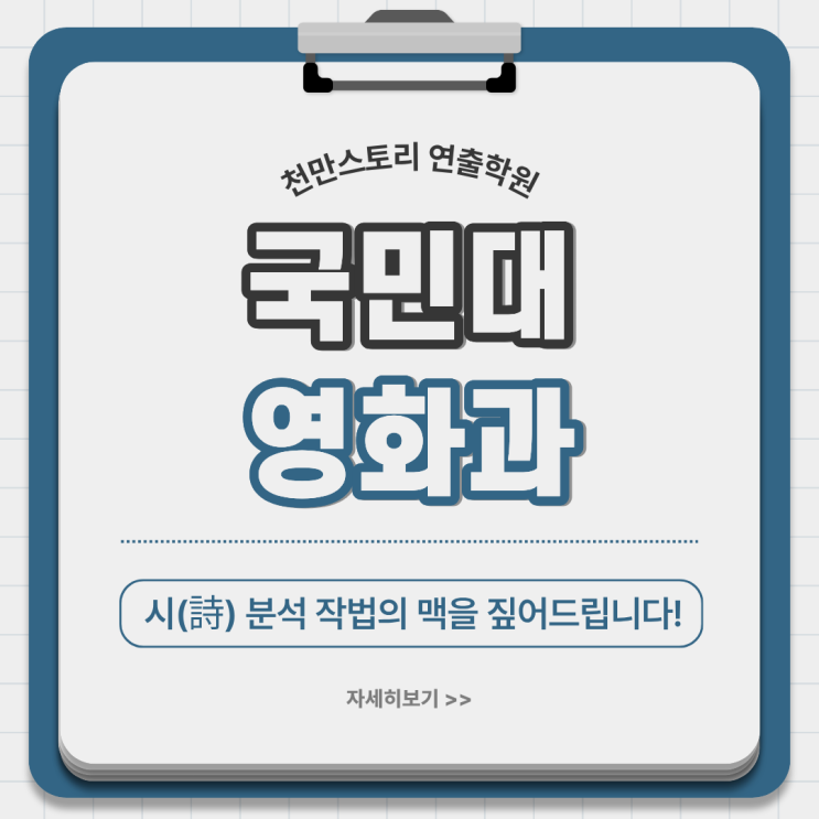 안녕하세요 연출 입시의 압도적 해답을 제시하며 학생들의 꿈을 현실로 만들어가는 천만스토리 연출학원입니다! 영화과 입시를 준비하다 보면 가장 당황스러운 순간이 있습니다. 바로 시험지에 소설이나 상황 설명이 아닌, 한 편의 '시'가 덩그러니 놓여 있을 때죠. 그 대표적인 학교가 바로 국민대학교 공연예술학부 영화전공입니다. 국민대는 왜 시를 줄까요? 그리고 우리는 그 짧은 운율 속에서 어떻게 1,000자 넘는 영화적 서사를 뽑아내야 할까요? 오늘은 국민대 합격을 위한 '시 분석 작법'의 맥을 짚어드립니다. 국민대 실기 유형: 문학적 텍스트의 시각화 국민대 실기는 주어진 시를 읽고, 그 정서와 이미지를....... <img src="https://blogthumb.pstatic.net/MjAyNjA0MDRfMTUy/MDAxNzc1Mjk1NzU3Mjcz.e6OKqovg8SwyiB-_nbESWaw13fb78ygD89nL5FFoUnkg.jv9OqdBNZYWDJYRhuWSwQEeG8XbNooZBRS1dEbmfFaMg.PNG/1.png?type=s3" />