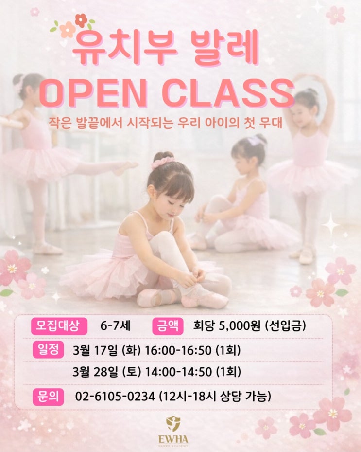 유치부 발레 OPEN CLASS 작은 발끝에서 시작되는 우리 아이의 첫 무대. 처음이라 더 설레고, 그래서 더 소중한 시간입니다. 발레는 자세와 표현력, 집중력을 함께 키워주는 수업입니다. 아이의 가능성을 가볍게 경험해 보세요. 모집 대상 6–7세 일정 3월 17일(화) 16:00–16:50 3월 28일(토) 14:00–14:50 체험비 회당 5,000원 (선입금) 정원 소수로 진행합니다. 문의 및 예약은 전화로 부탁드립니다. 02-6105-0234 (12시–18시 상담 가능) 010-7774-7161 아이의 첫 발레, 이화무용아카데미와 함께하세요. #유치부발레 #발레체험수업 #이화무용아카데미 #6세발레 #7세발레 <img src="https://blogthumb.pstatic.net/MjAyNjAyMjRfMjQ0/MDAxNzcxOTI4OTEzNzk2.N2E31AAzlSpluufQOJBUpzmusuXVqN-9w1tO_ndnBbYg.eL42LbeTTuXskNRj0m_oa9yUegWT3_DdLWsjo1zJQl8g.JPEG/IMG%A3%DF6632.jpg?type=s3" />