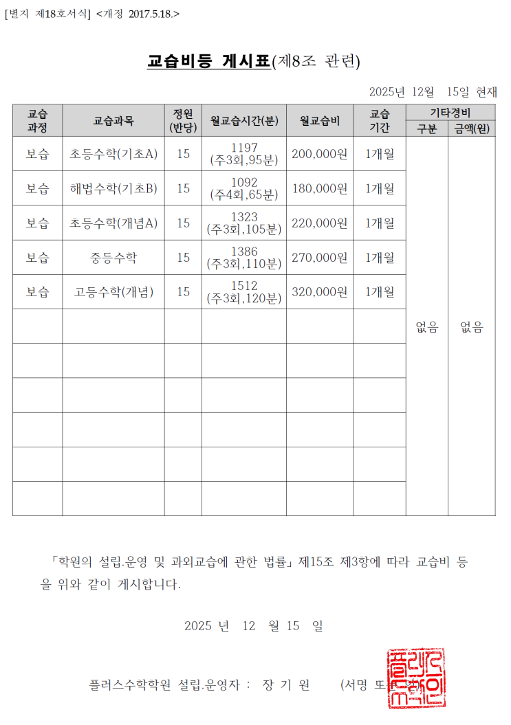 플러스수학학원 교습비 게시표 (2025년 12월 현재)
