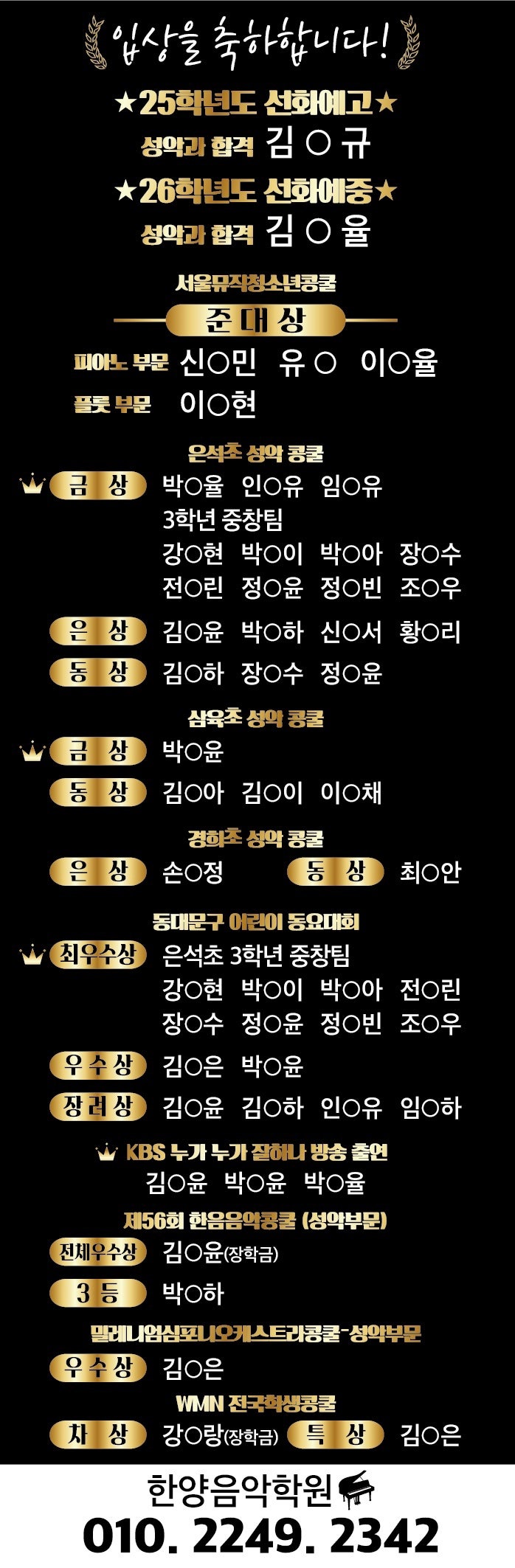 한양 친구들, 2025년 한 해 동안 정말 수고했어요 2025년 한 해 동안 한양 친구들이 보여준 결과를 정리하면서 지도하는 입장에서 참 보람찬 마음이 듭니다. 공부도 열심히 하면서 그 와중에 음악을 포기하지 않고 꾸준히 이어온 친구들, 그리고 무대 위에서 용기 있게 도전해 준 모든 아이들에게 진심으로 큰 박수를 보내고 싶어요 우리가 음악을 해야 하는 이유 음악은 단순히 실기 하나를 더하는 활동이 아니라 아이들의 삶 전반에 아주 큰 힘이 됩니다. •공부 외에 또 다른 집중력을 기를 수 있고 •연습과 음악 활동을 통해 머리를 환기시키는 역할을 해주며 •콩쿨과 무대 경험을 통해 사람들 앞에 서는 자....... <img src="https://blogthumb.pstatic.net/MjAyNTEyMjBfMTY1/MDAxNzY2MjMyMzczNTk0.tK49fjltDdqj4rbtdfMpi_qRR6KNLkQDKdEf0phw1w4g.pgSQcW7STRQJ-3rI4X95dGk2mBhQSYNUUlDg4Bmw6FEg.JPEG/IMG_8793.jpg?type=s3" />