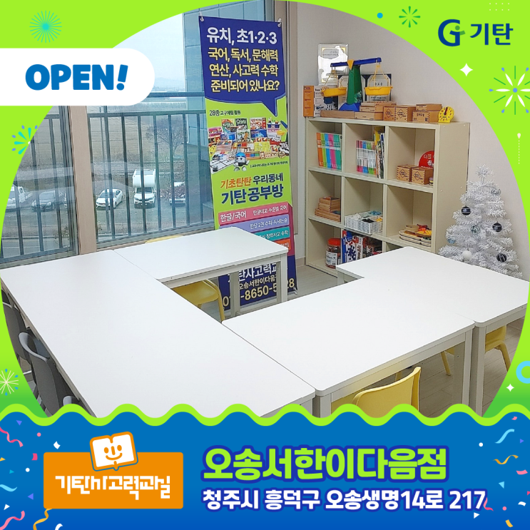 안녕하세요. 기탄사고력교실입니다. 청주시 오송읍에 새로운 기탄공부방이 문을 열었습니다. 이제 오송 지역에서도 유치, 초1·2·3 아이들이 스스로 생각하고 이해하며 배우는 기탄사고력교실의 교육 방식을 만날 수 있게 되었습니다. 이번에 새롭게 오픈한 오송읍 기탄공부방은 아이들이 편안하게 집중할 수 있도록 인테리어에도 많은 신경을 썼습니다. 전체 공간은 은은한 화이트 톤을 기반으로 구성해 밝고 정돈된 느낌을 주며, 곳곳에 배치된 산뜻한 노란색 의자가 공간에 활기를 더해줍니다. 또한 기탄의 28종 교구가 아이 손에 자연스럽게 닿을 수 있도록 낮은 높이의 오픈형 교구 진열대로 구성하여 아이들이 탐색하고 조작하기에 최적의 환....... <img src="https://blogthumb.pstatic.net/MjAyNjAxMTNfMTEw/MDAxNzY4Mjk0MTY2NDc3.56M-PSUrN2ujM8oK4xe_btfbz8r3QPvQ4aPMAUS8Rc0g.qsM7pL6XMzXyBsCipRpa4EPlAGOgWwHtl4HJFq7z5Ccg.PNG/2601_08_%C1%A4%B9%E6%C7%FC_%BF%C0%BC%DB%BC%AD%C7%D1%C0%CC%B4%D9%C0%BD%C1%A1.png?type=s3" />