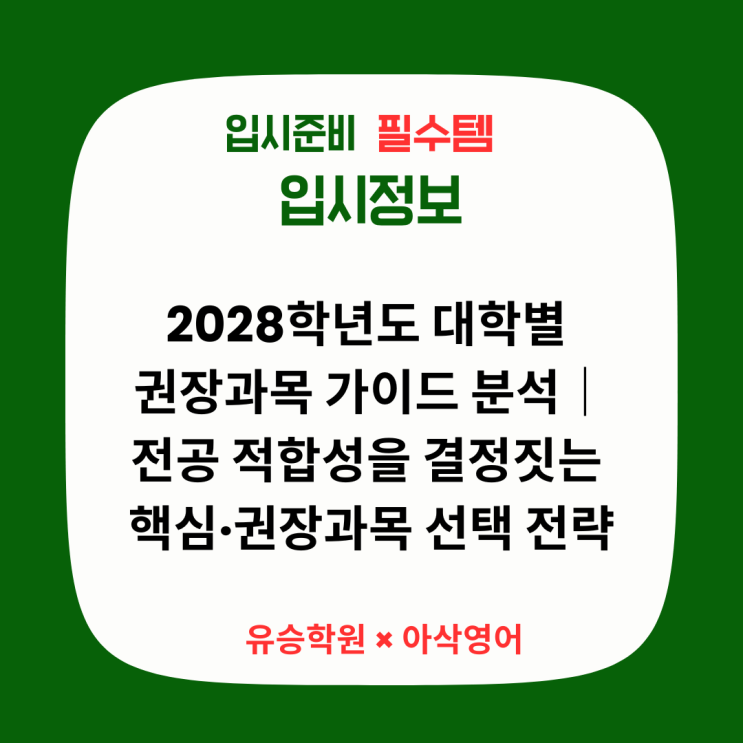 원주시 단구동에서 20년 넘게 국영수 학습을 지도하며 많은 학생들의 성장을 함께해 온 유승학원입니다. 유승학원은 수학·영어 전문 학원으로, 수학은 단계별 맞춤 수업, 영어는 아삭영어 원장님 직강 시스템을 통해 내신·모의고사 실력을 확실하게 끌어올립니다. 오늘은 「2028학년도 대학별 권장과목 자료집」 내용을 바탕으로 현재 중·고등학생들이 변화하는 대입 제도 속에서 어떤 과목을 선택하고 집중해야 하는지 핵심 내용을 정리해 드립니다. 2028 대입은 고교학점제와 맞물려 "무엇을 배웠는가"가 학생부 종합전형뿐 아니라 교과 전형에서도 매우 중요한 평가 잣대가 됩니다. ① '핵심과목'과 '....... <img src="https://blogthumb.pstatic.net/MjAyNjAxMTdfMTg1/MDAxNzY4NjQwODM1NTAx.KItYkalocOZBmysQDAwMuL_NzAqWxWsm15OyNi5orAkg.oGADTuNYSBYQeHwD_7BjXRoLZDA3NzmHd4StgR2EX0Eg.PNG/%28%C0%CE%BD%BA%C5%B8%B1%D7%B7%A5_%B0%D4%BD%C3%B9%B0%2845%29%29_%281080_x_1080_px%29_%281080_x_1080_px%29_%2823%29.png?type=s3" />