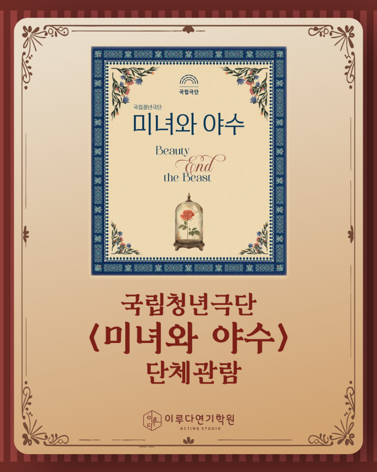 국립청년극단의 <미녀와 야수>를 관람하고 온 이루다 친구들! 국립청년극단의 <미녀와 야수>는 우리가 익숙하게 알고 있는 디즈니의 이야기가 아닌 원작 소설을 바탕으로 한 <미녀와 야수>입니다! 2025년부터 원주를 거점으로 활동 중인 국립청년극단 ! 같은 지역에서 만나 더욱 반가웠던 <미녀와 야수> !! 미래의 배우인 우리 이루다 친구들 ! 배우로서 또 한걸음 성장할 수 있는 소중한 시간 !! 이루다는 앞으로도 친구들과 함께 좋은 작품을 직접 만나고 경험해 나가겠습니다 #원주연기학원 #이루다연기학원 #강원도연기학원 #연극단체관람 #국립청년극단 #미녀와야수 #특별활동 #원주연기입시 #원....... <img src="https://blogthumb.pstatic.net/MjAyNjAxMjBfMTU4/MDAxNzY4ODg3NDYyMjIx.6crl9ZJyJWVyMI5lxY-jpZOK7gkRP0aTcbnOWe4UGNIg.d9ZirhzJgQre9xKCQtZq_a8_0KybPT9hfqnDtvIe-2cg.PNG/2.png?type=s3" />