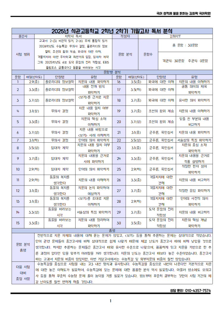 안녕하세요! 잊을 만하지 않아도 찾아오는 김희락 국어학원! 오늘은 석관고2 독서 시험지 분석의 시간입니다! 이번 기말고사에서는 수능특강 지문이 특히 많이 쓰였어요! 교과서는 별로 비중이 없습니다 ㅋㅋ 물론 저는 작년에 교과서 지문들을 모두 정리해놨기 때문에 자료를 많이 못 써서 결코 슬프지않흐르그ㅡ르르ㅡ유ㅠ 그럼 시험지 분석 시작해 볼까요!! [석관고2]2025년 2학기 기말고사 독서 분석 2학기 중간고사보다는 조금 더 쉽게 나온 느낌입니다! 아무래도 단어 파트에서 문제가 좀 쉽게 출제되어 그런 듯싶어요 ㅋㅋ 단어가 뭐가 나올 줄 몰라서 일단 최대한 나올 만한 것들을 아예 사전째로 암기 프린트에 실어서 힘을 줬는데 다행....... <img src="https://blogthumb.pstatic.net/MjAyNTEyMTVfODEg/MDAxNzY1NzM0MDY0NTI0.74UgxpfAyv6GkWJVWljSQOAhdOHkOtYu9mYSnmqe6lAg.SeGBMpmvmfiHJZy9UcTYczy8Hpv9_dX1kKmiYtU0RHog.PNG/2025%B3%E2_%BC%AE%B0%FC%B0%ED_2%C7%D0%B3%E2_2%C7%D0%B1%E2_%B1%E2%B8%BB%B0%ED%BB%E7_%B5%B6%BC%AD_%BA%D0%BC%AE001.png?type=s3" />