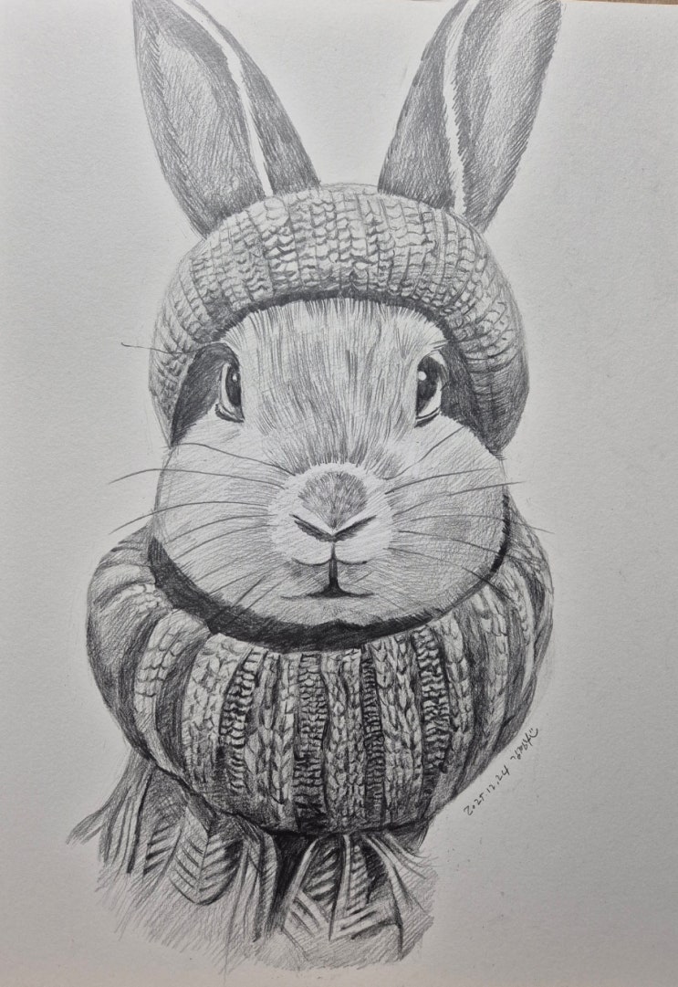 안녕하세요. 상상나무미술 김경하 원장입니다. 이제 2025년도 얼마 남지 않았네요.↕️ '소묘를 꾸준하게 해야하는이유' 기초소묘를 그림배울때 꼭 해야하는이유는 저번 블로그에도 썼었는데요. https://m.blog.naver.com/kidart_/224090090302 이번에는 끝나가는 2025년을 아쉬워하면서, 니트모자와 목도리를 착용한 토끼의 따뜻한 겨울모습을 그려보았어요. 사용한 재료 연필: HB, 2B, 4B 등 다양한 농도의 연필 종이: 켄트지 또는 드로잉 용지 지우개: 전동 지우개,연필 지우개 연필 드로잉 팁을 애기하면, 명암이 생명인데요.♀️ 연필 드로잉은 색이 없는 대신 명암으로 모든 걸 표현해요 밝은 부분은....... <img src="https://blogthumb.pstatic.net/MjAyNTEyMjZfMTg5/MDAxNzY2NzUzODI3NDc5.-OX1ucLiDM1xWwvirU5iB3z-j9k1S1_uB9YxBwSrDrAg.bMsBA-80fqJIhqGWgaJmLIDhYs6NSG8cihlwUqWUmcMg.JPEG/900%A3%DF20251224%A3%DF224541.jpg?type=s3" />