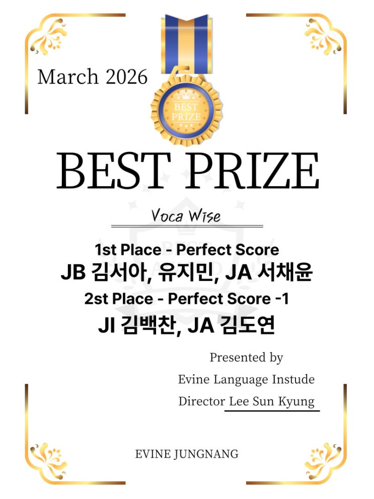 신내동영어학원 양원숲영어학원 중화초영어학원 3월 보카와이즈 시상 이번 3월에도 우리 이바인 친구들의 꾸준한 노력과 성장이 빛난 보카와이즈 시상이 진행되었습니다. 무엇보다 눈에 띄는 친구는 바로 서채윤 학생입니다. 총 4번의 보카와이즈 경시대회 중 무려 3번이나 만점상을 받았어요! 이건 단순히 잘하는 것을 넘어서, 꾸준함과 성실함이 만들어낸 결과라 더 값지게 느껴집니다. 또한 김도연 학생도 정말 아쉽고도 멋진 기록을 보여주었습니다. 딱 한 문제 차이로 만점을 놓쳤지만, 그럼에도 불구하고 2번이나 2등상을 받으며 안정적인 실력을 증명해주었어요. 이 ‘한 문제 차이’가 얼마나 큰 노력의 결과인지 알기에 더 크게 박....... <img src="https://blogthumb.pstatic.net/MjAyNjA0MDJfMTc4/MDAxNzc1MTE1NjU0MTUw.e0kdd7Ny914AkkmNtlSMoc3gm2yWuFyMSD0yPwZGslUg.KNPnLKJ3XmM29mqme6lxhRypBSZqDURavFtjrW0SXkkg.JPEG/%C1%A6%B8%F1%C0%BB-%C0%D4%B7%C2%C7%D8%C1%D6%BC%BC%BF%E4_-001_%2819%29.jpg?type=s3" />