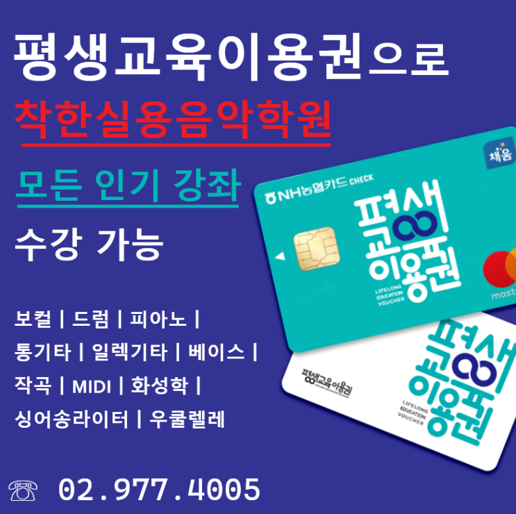 ★ 2026년 '평생교육이용권' 사용하는 방법 '평생교육이용권' 이용은 아래 '평생교육학원'(착한실용음악학원)에서 사용하시면 됩니다 (서울지역 신청기간 → 3월 16일~ 4월 9일(목) 18시까지 입니다) '평생교육이용권'을 가장 가치있게 이용하는 방법을 소개 합니다. 1차 지원금 : 35만원 평생교육이용권 추첨 발표일 : 4월 28일(화) ❤️ 서울 평생교육학원 → '착한실용음악학원입니다. 평생교육이용권으로 보컬(노래), 기타, 드럼, 베이스 피아노, 우쿨렐레, 작곡, 미디, 레코딩 등 원하는 음악을 일대일로 평생동안 배울 수 있는 학원입니다. ❤️상담 예약 ❤️ 02-977-4005 010-52....... <img src="https://blogthumb.pstatic.net/MjAyNjA0MDRfNjQg/MDAxNzc1MzA0NjMwNzk5.Lt67O71PNC2x5OzPWwtesx_49mxUqCMCP8Dj424in4Mg.d8vVWG7xltRPDufXMmpwqllcrIYg3zx-ZMKEyz-Z-tMg.PNG/%C6%F2%BB%FD%B1%B3%C0%B0%C0%CC%BF%EB%B1%C7_%BC%F6%B0%AD%B0%A1%B4%C9.png?type=s3" />