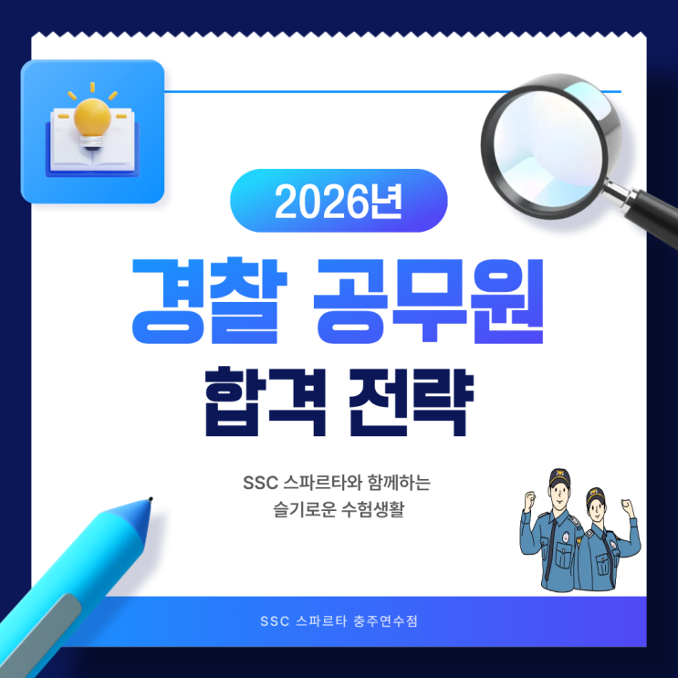 안녕하세요 SSC 스파르타 충주연수점입니다 2026년 경찰공무원 시험이 큰 변화를 맞이했어요. 특히 체력검사 방식과 선발 기준에서 중요한 개편이 있었죠. 그런데! 시험이 어려워졌다고 걱정만 할 순 없잖아요? 준비가 잘 되어 있다면 오히려 기회는 더 커질 수 있어요. 저희 SSC 스파르타 충주연수점에서는 이런 변화에 맞춘 완벽대비 학습 시스템을 운영 중이랍니다. SSC 스파르타 관리형 시스템 합격자들이 입을 모아 말하는 한 가지! “관리가 합격을 만든다” 저희 SSC 스파르타에서는 이 슬로건을 현실로 만들어드리고 있어요. 일일 순공시간 10시간 확보 시스템 출결부터 계획, 수행까지 꼼꼼하게 체크! '오늘 얼마나 공부....... <img src="https://blogthumb.pstatic.net/MjAyNjAxMTVfMTkw/MDAxNzY4NDU1NDYzMzQ1.9mkMdpsz-eCH9EecNNO344FOh6gMqS3s1wTHqmOsdoMg.5l0vV6c014zbOzngq7VccPipuPYVy4t1eles5rgOYnYg.PNG/1.png?type=s3" />