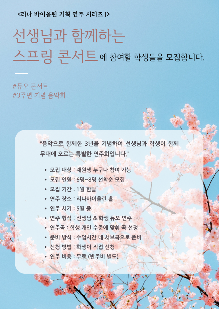 안녕하세요.오는 3월, 리나 바이올린이 오픈 3주년을 맞이하게 되었습니다. 3년전 오픈 준비하면서 떨리고 설레였던 기억들이 아직도 생생하고 3년동안 함께한 제자들에게도 너무 고맙기에 이번에는 3주년 감사 이벤트를 준비했습니다. ✔ 선생님과 함께하는 스프링 콘서트(기획 연주 시리즈1) ✔ 리나 바이올린 6행시 짓기(감동상,코믹상 재치상 증정) ✔ 3가지 미션 완료 시 기념 선물 증정(설문지 작성,음악능력평가,게임) 따뜻한 봄날 선생님과의 듀오 콘서트로 멋지고 아름답고 감동적인 연주회가 되도록 열심히 준비하겠습니다.(8명 조기마감 되었습니다.) <img src="https://blogthumb.pstatic.net/MjAyNjAxMjBfMTA2/MDAxNzY4OTA1MzM1NjY4.n49JGxZHTLfFyqpKFEL1eXSqtqy2dJvGV5WyY-nGsjwg.L3LuCbRuTdKB5YpNTCoQ4wpnSGs9pQ9fAyKSpuSGeCsg.PNG/Purple_Futuristic_Music_Festival_Flyer_Potrait.png?type=s3" />