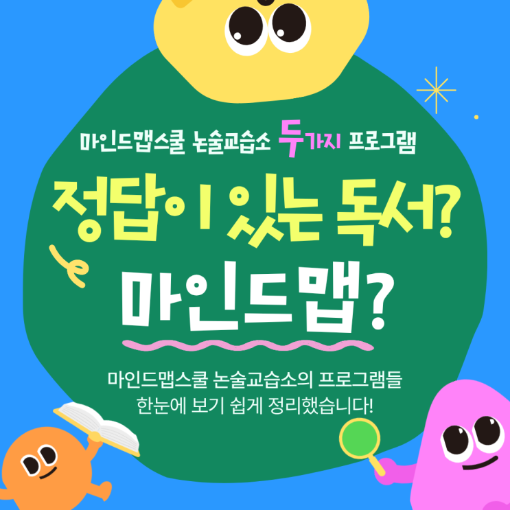 마인드맵스쿨 논술교습소에는 두 가지 프로그램이 있습니다! 정답이 있는 독서 & 마인드맵 마인드맵스쿨의 프로그램을 한눈에 보기 쉽게 정리해봤어요 생각을 키우는 환상의 짝꿍! 함께할 때 더 강력해지는 두 프로그램입니다 :) 하나, 정답이 있는 독서 책을 정확하게 읽는 힘을 기릅니다. 내용을 이해하고, 근거를 바탕으로 추론하는 독서 수업이에요. - 글의 핵심 내용을 정확하게 이해하기 - 문맥을 근거로 생각을 추론하기 - 읽은 내용을 말과 글로 표현하기 이런 질문들이 아이들의 생각을 넓혀요. Q. 펭귄들은 왜 버려진 알 주변에는 가지 않았을까요? Q. 이 장면은 누구의 시선으로 그려진 그림일까요? 정....... <img src="https://blogthumb.pstatic.net/MjAyNTEyMjZfMjYy/MDAxNzY2NzI3NzA5MjY5.ct03UkzhskMOQf80z3rkIRuLV49SYkpIH7Z_gq_HlSAg.Mr7bLVrieZpKcv_IhCfTAxMAREDz8PYUFC_mSvIp93Ig.PNG/1.png?type=s3" />