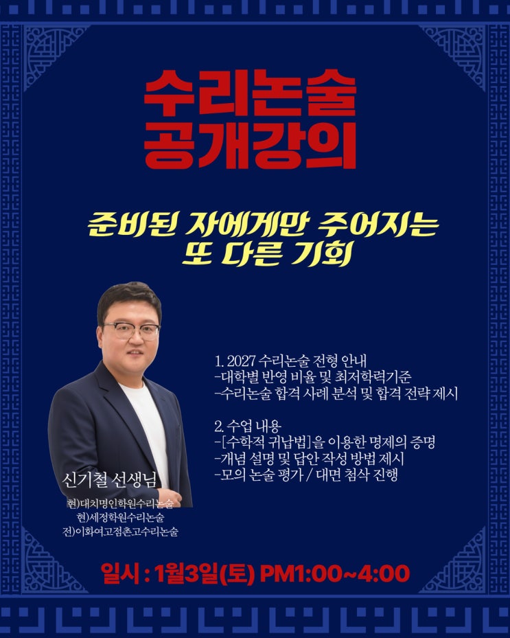 수리논술 공개특강 수리논술, 지금 경험하라! 수리논술, 어떻게 준비해야 할지 막막하다면 시작 전 필수 특강 들어보면 다릅니다. 수리논술, 미리 경험하는 것이 가장 중요합니다. 많은 신청부탁드립니다! 일시: 1/3(토) PM1:00~4:00 ◆ 고3 시간표 바로 가기 ◆ https://zrr.kr/TioSuJ ☎ 수강 예약/문의 ☎ ▶ 02-742-0777 [성북] ▶ 010-3664-0773 (문자) ※ 문자 예약시 학교, 학년, 이름 필수 ♥ 대치명인학원 성북캠퍼스 오시는 길 ♥ <img src="https://blogthumb.pstatic.net/MjAyNTEyMjdfMTAg/MDAxNzY2ODExNzE1ODQ4.PQCFm0uwgFXTi-0Xbyv7TBbbdDTcpEsmt9n27XTsl9Ug.qSpXwfn1KGZPdxqmaIaNY7MgDDVXFuJTonTW1L80baAg.JPEG/%BC%F6%B8%AE%B3%ED%BC%FA.jpg?type=s3" />