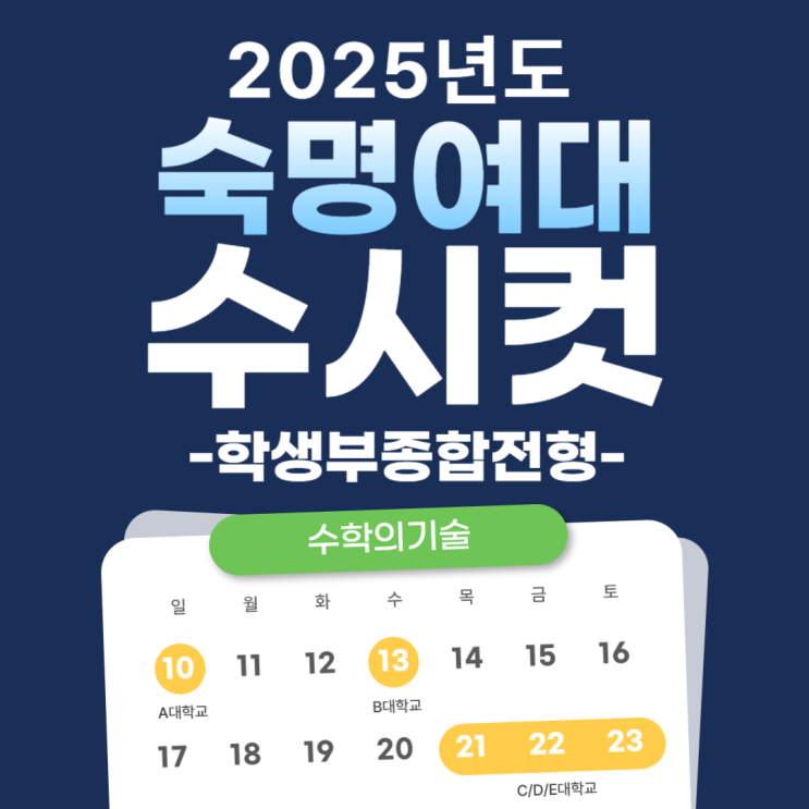 안녕하세요. 수학의기술학원 입니다! 오늘 숙명여대 수시등급, 숙대 수시컷을 알아보고 전형까지 확인해볼 예정입니다. 정시전형 및 다른 대학정보도 미리 정리해두었으니 카테고리 '대입정보'를 참고해주세요. 그럼 등급컷 먼저 사진자료로 확인해보겠습니다. 표도 크게 확인해보겠습니다. 50컷 및 70컷을 각각 노란색, 분홍색으로 색상을 적용해두었으니 참고해서 확인하시면 좋을 것 같습니다. 전형에 대해서도 이어서 확인해볼게요. [전형별 주요사항] [숙명인재(면접형)전형] *단계별전형* *수능최저학력기준 미적용* -모집단위: 인문계, 자연계(일부 모집단위 제외), 약학부 선발 -수능 이후 면접(제출서류 기반의 블라인드 면접....... <img src="https://blogthumb.pstatic.net/MjAyNTEyMjdfMTk5/MDAxNzY2ODIwMzY2MDkz.sK9payhB4TZvdideGA72GE_EYQByjWJy__fnNkOInlcg.uhVezE-kNKxGSXbhEf4pBPg1Y_alexatEOx1LgmHYAkg.PNG/001.png?type=s3" />