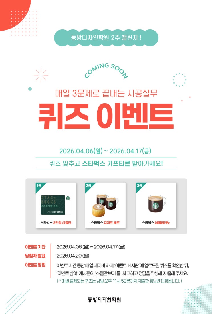 안녕하세요, 동방디자인학원입니다 실내건축기사 1회차 실기 시험을 앞두고 수강생분들의 시공실무 학습을 돕기 위해 매일 참여할 수 있는 퀴즈 이벤트를 준비했습니다. 이번 이벤트는 매일 3문제씩 시공실무 기출 기반 퀴즈가 출제되며, 짧은 시간으로도 꾸준히 복습할 수 있도록 구성되어 있습니다. “ 정답 많이 맞추면 상품까지 ! ” 정답을 많이 맞춘 참여자 중 상위 1~3등을 선정하여 상품을 드립니다. 1등 : 스타벅스 2만원 상품권 2등 : 스타벅스 디저트 세트 3등 : 스타벅스 아메리카노 < 참여 방법 > 이벤트 기간 동안 네이버 카페 ‘이벤트 게시판’에 업로드되는 퀴즈를 확인한 뒤, ‘이벤트 참여’ 게시....... <img src="https://blogthumb.pstatic.net/MjAyNjA0MDFfMTQ4/MDAxNzc1MDMxMzkxNDky.vFvTI3339J-7YCCKYaZAmcQKr4N1iF9qudPjtUSobFQg.52OIUTgfNX690pCY3UU1-VZhhl5dczdYkS9IO8DhdCgg.JPEG/quizevent_2026_2.jpg?type=s3" />
