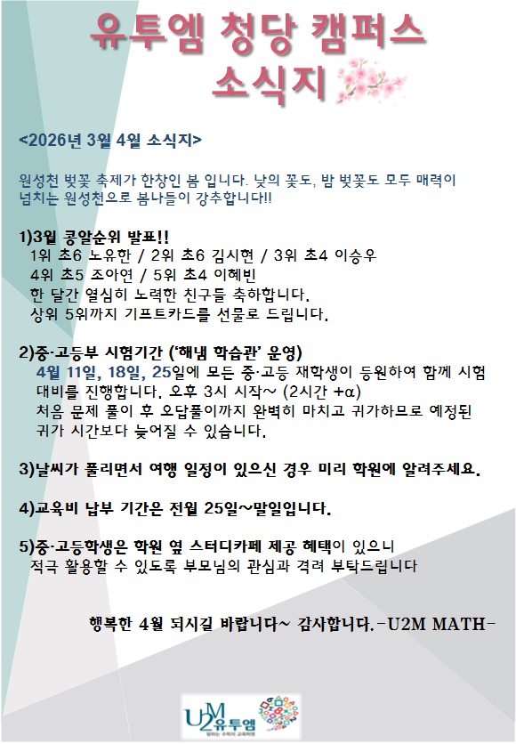 유투엠 청당캠퍼스 학부모님게 드리는 4월 소식지