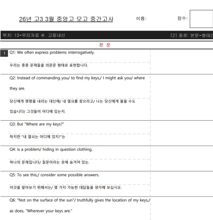 26년 고3 3월 모고 중앙고 중간고사 워크북 pdf