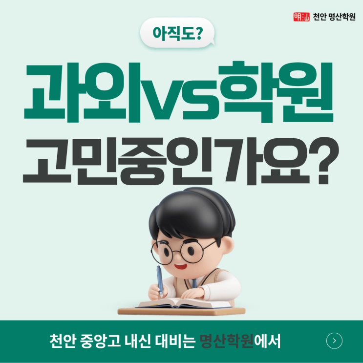 안녕하세요 천안 중앙고 학부모, 학생 여러분! 이제 개학하고 한달이 지났네요. 다들 내신, 수능 준비가 잘되고 있나요? 성적이 공부한 것만큼 잘 나오지 않나요? 학원을 다니고 있는데, 영 변화가 없나요? 국어, 영어, 수학 열심히 공부하지만 성적이 잘 안나오는 학생이라면 특히, 이번 글에 주목하면 좋을거에요! 1. 천안중앙고 수학과외 vs 수학학원, 아직도 고민 중이라면 천안중앙고 내신을 준비하는 학생과 학부모님들이 가장 많이 고민하는 부분이 있습니다. “수학과외가 나을까, 학원이 나을까?” “지금 성적에서 어떻게 올려야 할까?” 특히 중앙고는 단순히 문제를 많이 푼다고 해서 성적이 오르는 구조가 아닙니다. 시험 자체....... <img src="https://blogthumb.pstatic.net/MjAyNjAzMzFfMTY4/MDAxNzc0OTUxNjc5MTM2.aBS18G6BfomAChpw1RqciLFfAwUyEbe4i16E4kiZxtAg.wsUMqjaVkdcT8xpmLibWCuavFCuUAcSXYRHtKtT41ZQg.PNG/%C3%B5%BE%C8%C1%DF%BE%D3%B0%ED_%BC%F6%C7%D0%B0%FA%BF%DC_%BC%F6%C7%D0%C7%D0%BF%F8_%B0%ED%B9%CE%C0%CC%B6%F3%B8%E91.png?type=s3" />