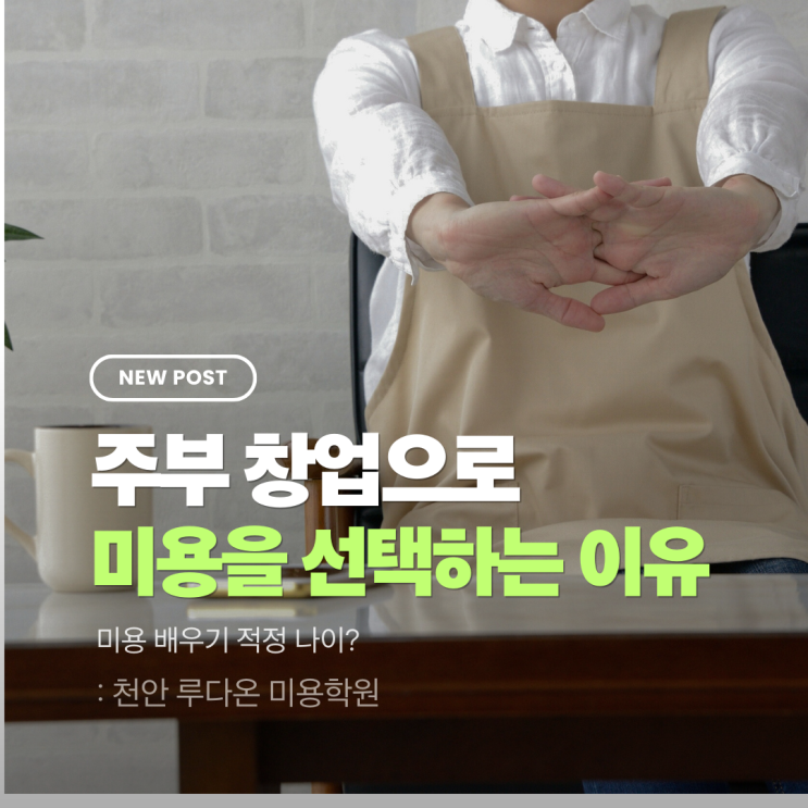 새로운 도전을 고민하고 있다면 지금이 가장 좋은 시작일 수 있습니다. 작은 시작이 큰 변화를 만들 수 있습니다. 안녕하세요 :) 루다온 미용학원 입니다. 요즘 상담을 하다 보면 주부 창업 문의가 정말 많습니다. 그중에서도 미용 기술을 배우고 창업을 고민하는 분들이 늘고 있습니다. 주부 창업이 늘어나는 이유 최근에는 육아나 가사로 인해 시간 활용이 중요한 분들이 많습니다. 그래서 시간 조절이 가능한 직업을 찾는 분들이 늘고 있습니다. 뷰티 분야는 예약제로 운영되는 경우가 많아 근무 시간을 비교적 자유롭게 조절할 수 있다는 장점이 있습니다. 이러한 이유로 주부 창업을 준비하는 분들께 관심이 높은 분야이기도 합니다. 비교적....... <img src="https://blogthumb.pstatic.net/MjAyNjAzMTNfOTgg/MDAxNzczMzg0MDIxMDY0.bTTpqJdvNLEQy23kplGKE8i2Wtktorsl5Q64LLxlKh4g.8jXyaskTE2ZRZrpdpVa3L3rbRZBAnWs1wnBijOJ16Fgg.PNG/%3F%9D%B0%3F%83%89%EA%B3%3F_%EA%B2%3F%3F%A0%95%3F%83%89_%EA%B9%94%EB%81%94%3F%95%9C_%3F%82%AC%EC%A7%84%EB%B0%B0%EA%B2%3F_SNS_%EB%B8%94%EB%A1%9C%EA%B7%3F_%EC%B9%B4%EB%93%9C%3F%89%B4%3F%8A%A4_%3F%3F%3F%9D%B4%3F%3F_%3F%8F%AC%3F%8A%A4%3F%8A%B8_%3F%8D%B8%3F%84%A4%3F%9D%BC_%3F%9D%B8%3F%8A%A4%3F%3F%EA%B7%B8%EB%9E%A8_%EA%B2%8C%EC%8B%9C%EB%AC%3F_%2826%29.png?type=s3" />