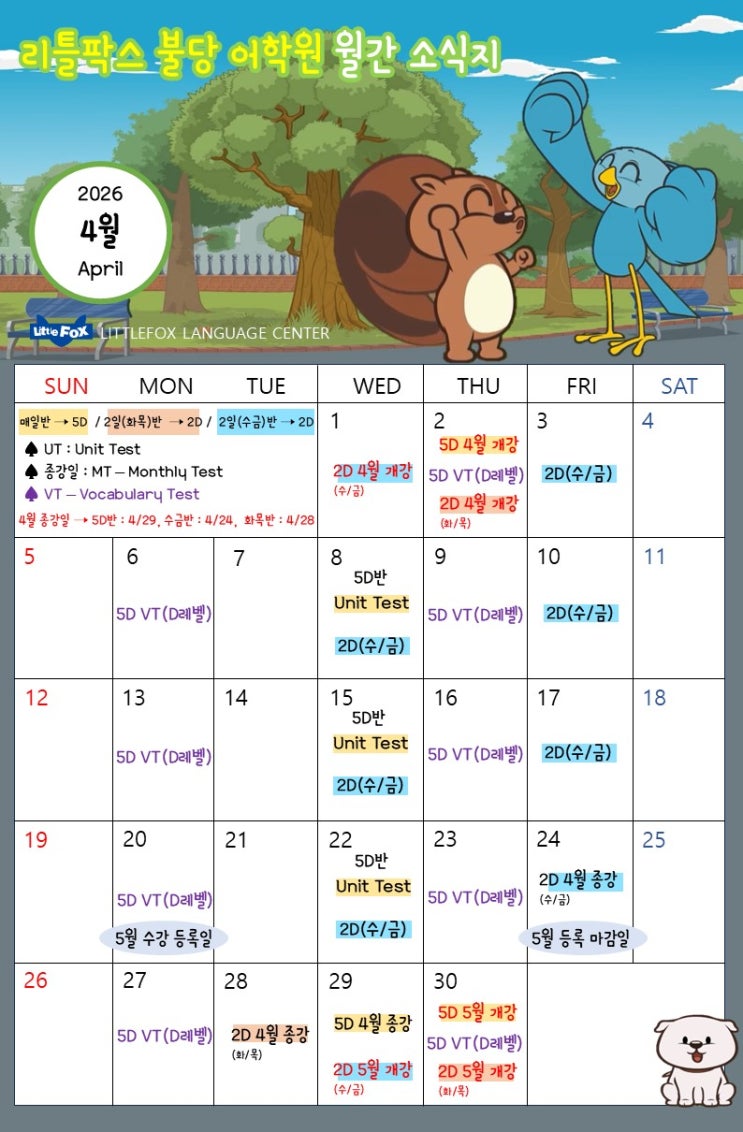 안녕하세요*^^* 리틀팍스 불당 어학원입니다 4월 스케줄을 안내드립니다 ◎ 4월 개강일 ~ 종강일 안내 ◎ * 매일반 : 4월 2일 ~ 4월 29일 *수금반 : 4월 1일 ~ 4월 24일 *화목반 : 4월 2일 ~ 4월 28일 :: 리틀팍스 불당 어학원 :: <img src="https://blogthumb.pstatic.net/MjAyNjAzMjdfMTI5/MDAxNzc0NTg5OTg0NzU4.Mf_845vsdW5PNQwLTwDXUn79xW1gHpntv0KtACUrfoIg.LfXzdMIHsAVRi5QpCm5gpWotMt4CMSqlkX0GdlzsAYMg.JPEG/2026%B3%E2_4%BF%F9_%BF%F9%B0%A3%BC%D2%BD%C4%C1%F6.jpg?type=s3" />