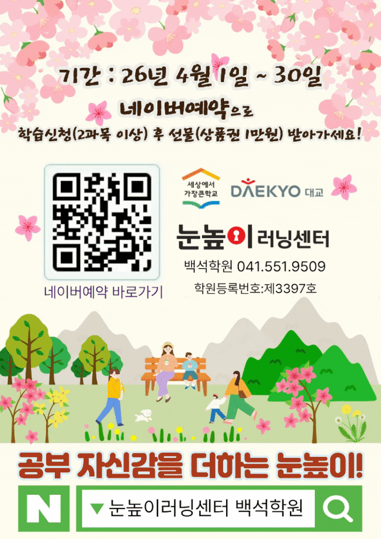 2026년 4월 눈높이러닝센터 백석학원 네이버 예약 이벤트 안내 드립니다. 아래 [네이버예약]을 누르시고 꾹!!! 상담 예약을 해주세요~ <img src="https://blogthumb.pstatic.net/MjAyNjAzMzFfMTc3/MDAxNzc0OTM0NzM3MTA1.e6CBFPftOjZ-QZ91DBSX6KM8pWxY_n4PNj4VxqBWDfEg.F8a3Ea5JCSurUoozOhAe6asoxznFtWhoR_ePqDsvW5Qg.GIF/%B9%E9%BC%AE.gif?type=s3" />