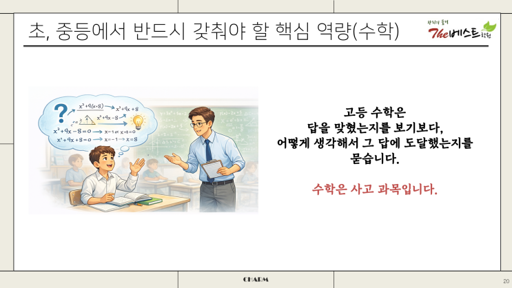 안녕하세요, 더베스트학원 원장 레이첼입니다. 방학 동안 진행되는 수학 특강을 떠올리면 많은 분들이 먼저 선행 과정을 생각하십니다. 하지만 수학에서 중요한 건 '미리 나가느냐'가 아니라 왜 그 내용을 미리 다뤄야 하는가입니다. 수학이 힘들어지고 무너지는 시점은 새 단원을 처음 배울 때가 아니라, 그 내용을 이용하여 처음 스스로 생각해야 하는 순간입니다. 공식을 외우고 적용하는 단계까지는 괜찮지만, 그 공식을 언제, 왜 써야 하는지를 묻는 순간 사고의 공백이 드러납니다. 겨울방학 수학 특강은 이 공백을 메우기 위해 다음 학기에 요구될 사고의 깊이와 질문의 수준을 미리 준비하는 시간입니다. 더베스트학원의 겨울....... <img src="https://blogthumb.pstatic.net/MjAyNTEyMjNfMTIx/MDAxNzY2NDg0NDA5MDU5.9C23iTWM0zeE-CIkeAUroQx-_99GFSmRLWJoX07GVaog.xJ5-dFThr1V-mJxHKSDUeWROFHM6g8G1FhQmOz5WjL0g.PNG/%BD%BD%B6%F3%C0%CC%B5%E520.PNG?type=s3" />