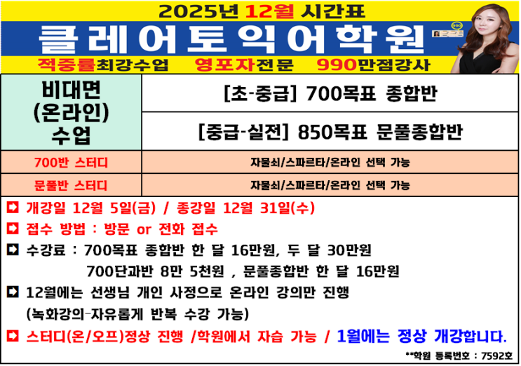 클레어토익 25년 12월 시간표 ✔️12월 온라인 수업만 진행 / 1월에는 정상 개강합니다. ✔️스터디 전담쌤이 가르쳐주는 무료 과외 스터디 (자물쇠/스파르타반 선택) ✔️ 학원에서 자율학습 할 수 있어요 :) ✔️수강문의 010 2846 2401 <img src="https://blogthumb.pstatic.net/MjAyNTExMjBfMTU1/MDAxNzYzNjA1MDU4MTA5.rTHvhjC1VaGOBF8e3ieL94jjXZcVhy19oGbhdmSJ20Yg.-SvmclJXOUWHuMnf-xrOwVVcP89IGjzEIJJcDBpjMT8g.PNG/25%B3%E2_12%BF%F9.png?type=s3" />