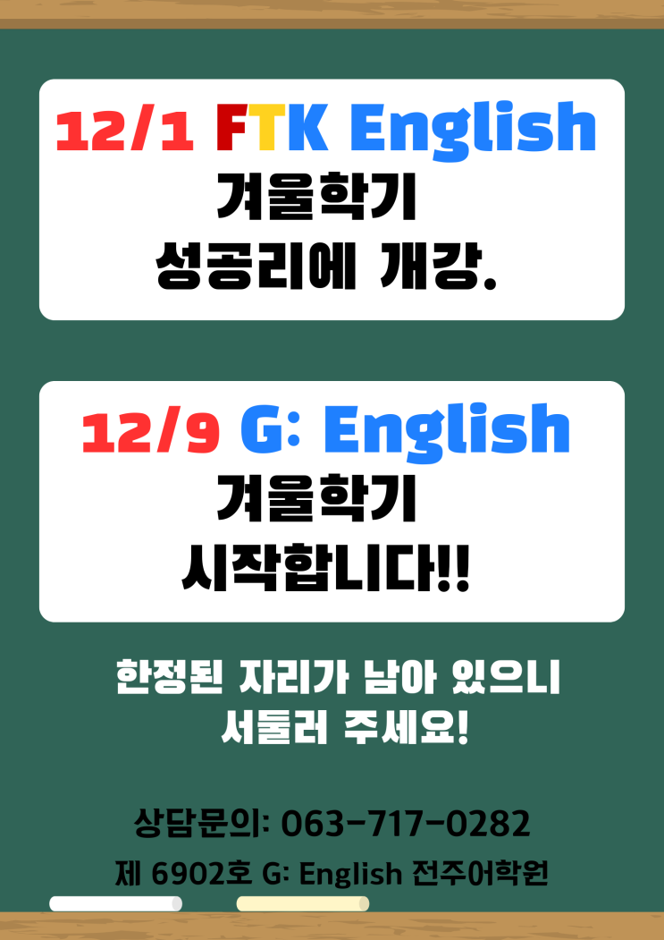 안녕하세요! 중, 고등 영어 1등급 프로젝트 G:ENGLISH입니다. 2025-26 겨울학기 개강을 앞두고 G:ENGLISH에서는 재원생 모두 2학기 기말고사 대비를 철저히 준비하고 있습니다. 기말고사 내신 대비가 끝나면 겨울학기가 12월9일부터 시작 됩니다. 겨울학기 개강 전 신규테스트를 통해 학생의 실력을 파악하고, 학습 계획 및 방향을 G:ENGLISH에서 설정하세요! 겨울학기 자리가 한정되어 있으니 서둘러 문의 주세요! 제 6902호 G: 지잉글리쉬전주어학원 ☎️ 상담문의 ☎️ 063-717-0282 에코 로터리 포레나 건너편 던킨도너츠 건물 4층 <img src="https://blogthumb.pstatic.net/MjAyNTEyMDVfOTUg/MDAxNzY0OTM4NDE3OTk1.oAFZSXb0oGDyHr2pXv979YgZn-e4lUOFS3HMQF-5Bskg.krNaq8_ypgJ9B9P_gYcg2m6hGAabuc3CaSldcBHDjrMg.PNG/%B0%DC%BF%EF%C7%D0%B1%E2%B0%B3%B0%AD_1205.png?type=s3" />