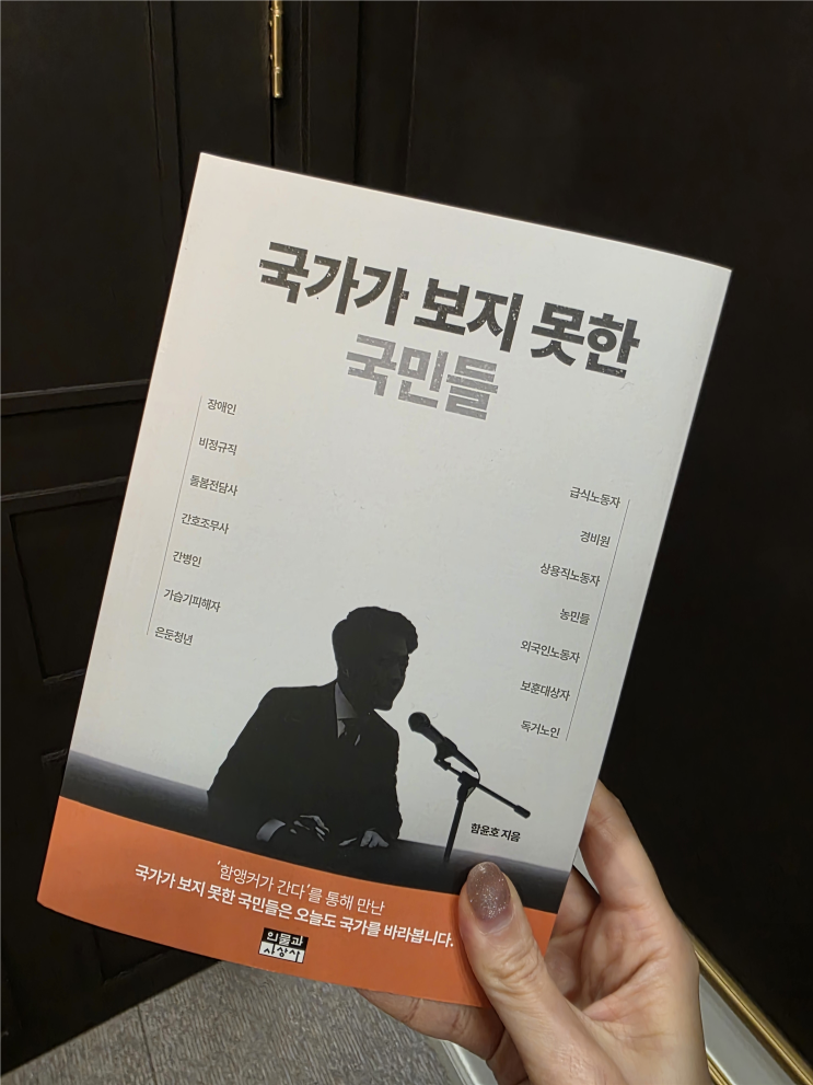 우리는 보통 ‘KBS 아나운서 함윤호’라고 하면, 밝은 조명 아래 멋진 슈트를 입고, 완벽하게 갖춰진 모습으로 카메라 앞에 선 그 장면을 떠올립니다. 하지만 이 책 국가가 보지 못한 국민들을 읽다 보면, 그 화려함 뒤에 가려졌던 또 다른 얼굴을 만나게 됩니다. 저자는 오랜 시간 소외된 사람들의 목소리를 들으러 현장을 직접 찾아다닌 발걸음을, 꾸밈없이 진솔하게 담아냈습니다. 책장을 넘길 때마다 ‘읽었다’기보다 ‘함께 걸었다’는 느낌이 들었습니다. 마을의 골목 사이를 지나고, 저 멀리 보이지 않는 곳까지 가서 누군가의 이야기를 듣고, 그 마음을 품에 담아 돌아오는 여정이 제 눈앞에서 펼쳐지는 듯했습니다. 그 한 걸음, 한 걸....... <img src="https://blogthumb.pstatic.net/MjAyNTEyMTBfMjM2/MDAxNzY1MzU5MzQ4OTA3.S1uamu9MwSl0_S5rBx5ILt9nXvu4bAQ6SlfOxHIzY-8g.6uKoyIeFJUoI7jK1qDaq4tAva_KfClOvUqYNbTh672cg.PNG/image.png?type=s3" />