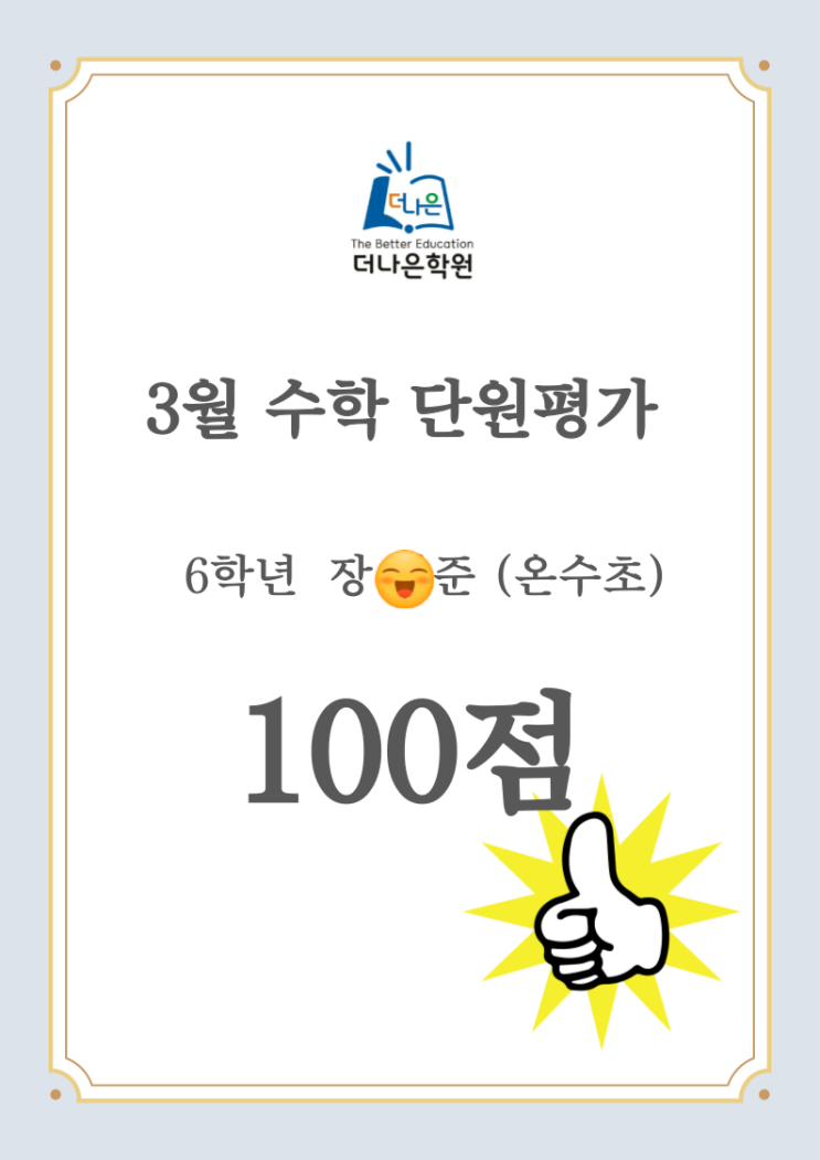 6학년 1학기 1단원 분수의 나눗셈 단원평가 결과 1:1 맞춤학습으로 이루어낸 소중한 결과 입니다. 수학에 대한 자신감이 많이 떨어졌던 친구이지만 겨울방학을 잘 활용하여 부족한 부분을 채워주니 단원평가도 우수한 성적을 받아왔어요 학교 끝나자마자 1등으로 달려 오는 친구랍니다. 더나은 해법 수학/뮤엠영어 전문학원에서는 확실한 개념과 반복 학습으로 학교 시험 정도는 가볍게 치를 수 있도록 꼼꼼하게 지도하고 있습니다. 아이들은 학교 시험만 잘 보아도 친구들 사이에서 수학 천재가 되어있답니다. <img src="https://blogthumb.pstatic.net/MjAyNjA0MDdfMjQ0/MDAxNzc1NTU5Njc2NTk5.TXcQIirGFXrs-1a93Pt0qXEsMvaID6tHf1IPpUwvEVQg.76WDuhBPRW8dGmUte8Hk43-jGz-bnoHMKhLdOIpOmRcg.PNG/001.png?type=s3" />